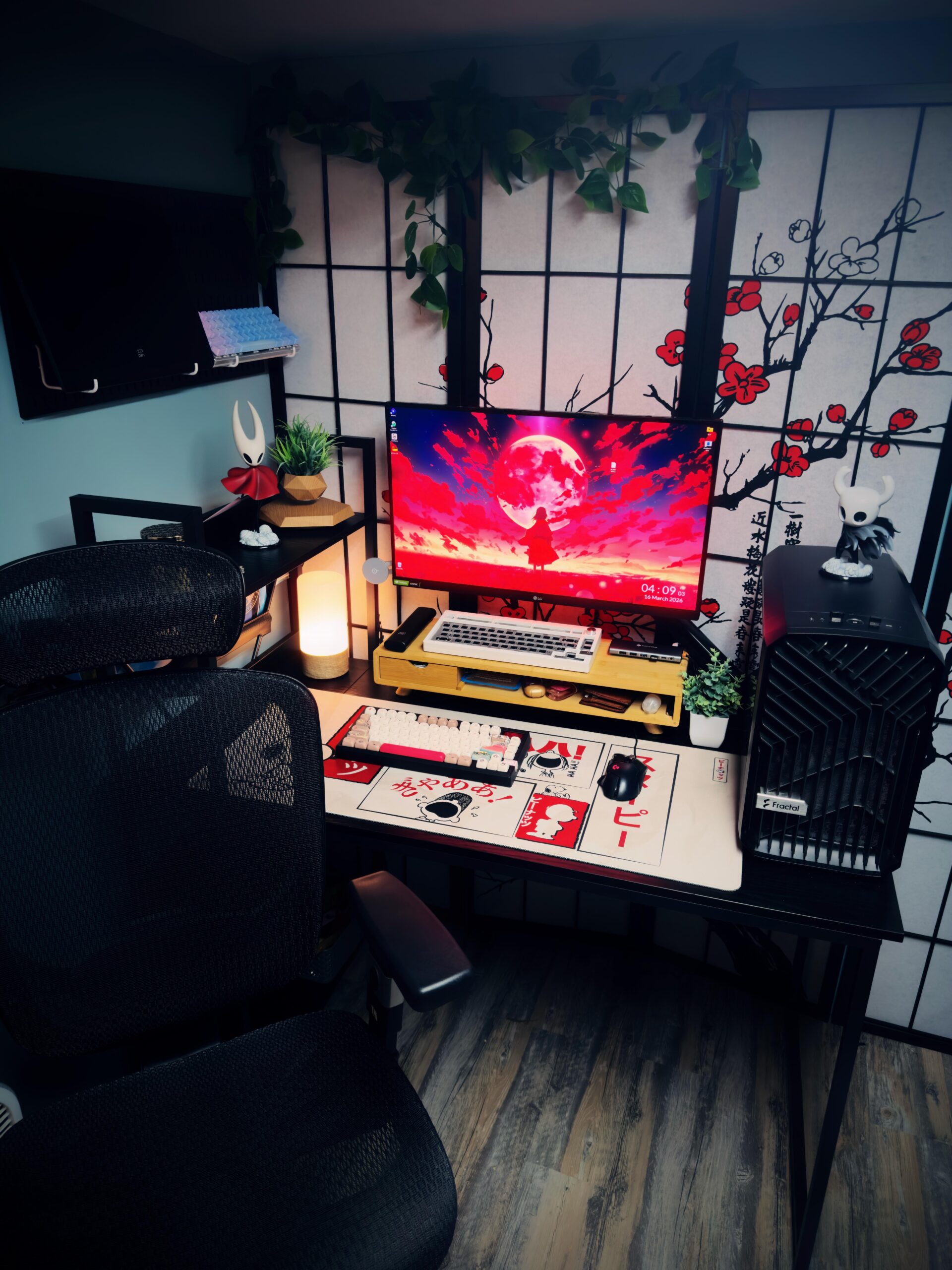 Pretty much finished, might wanna get a couple more hanging plants in somewhere. Orange glow strip behind the monitor, cables routed thoroughly, 2 retractable type c cables at the front lip of my desk, mag safe wireless charger left side of monitor. Super proud of this.
