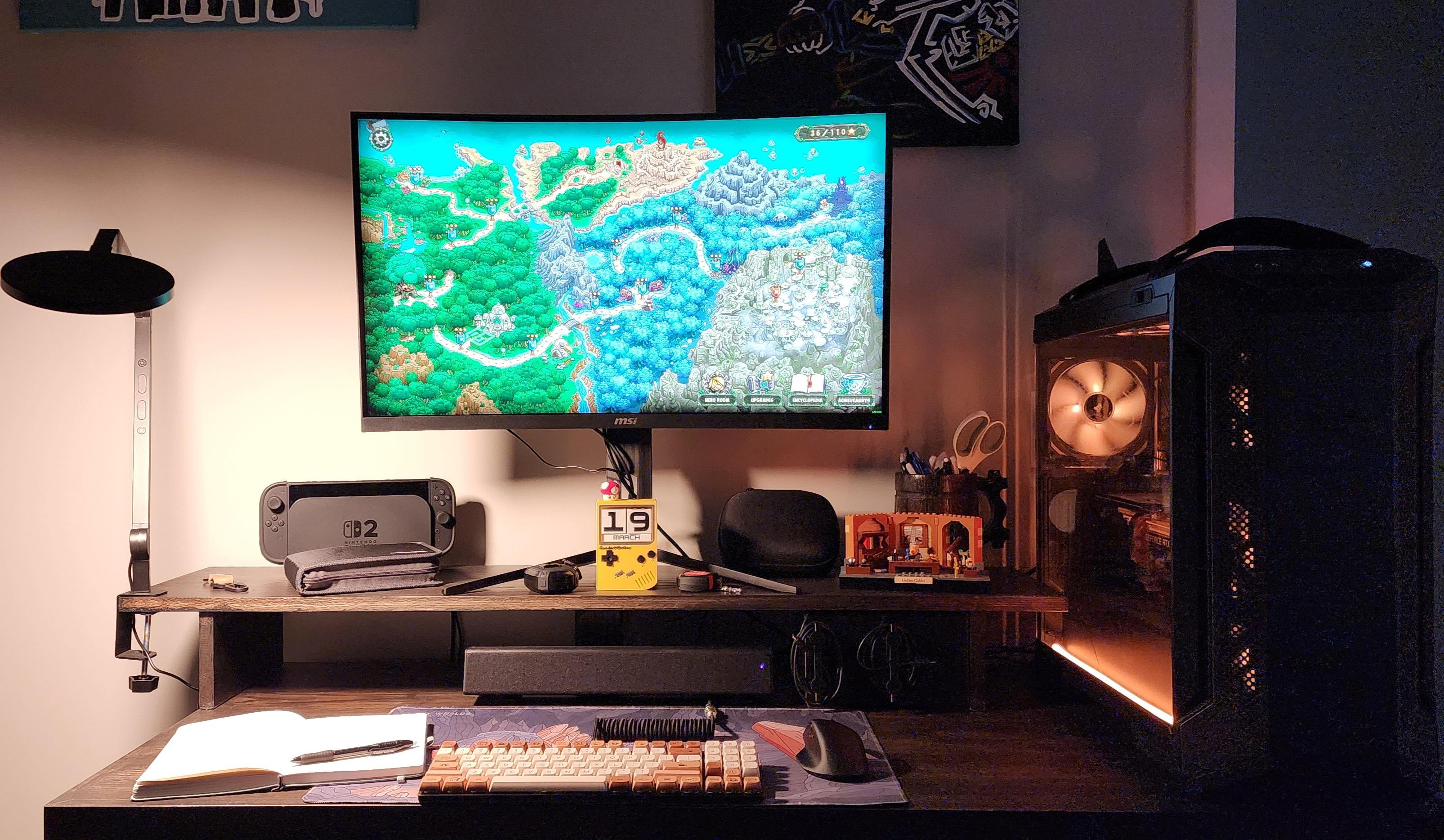 Device list: MSI MAG CUPDF 32 inch monitor, Nintendo Switch 2, New Nintendo 3DS XL, Lume Cube Edge Light 2.0 lamp, Creative Stage SE Mini soundbar (I like that it's only ONE usb-c cable direct to the PC, and I can switch to Bluetooth and it auto connects to the Switch 2), Keychron K13 keyboard and Keychron M6 wireless mouse, 5800x + 3070 PC.