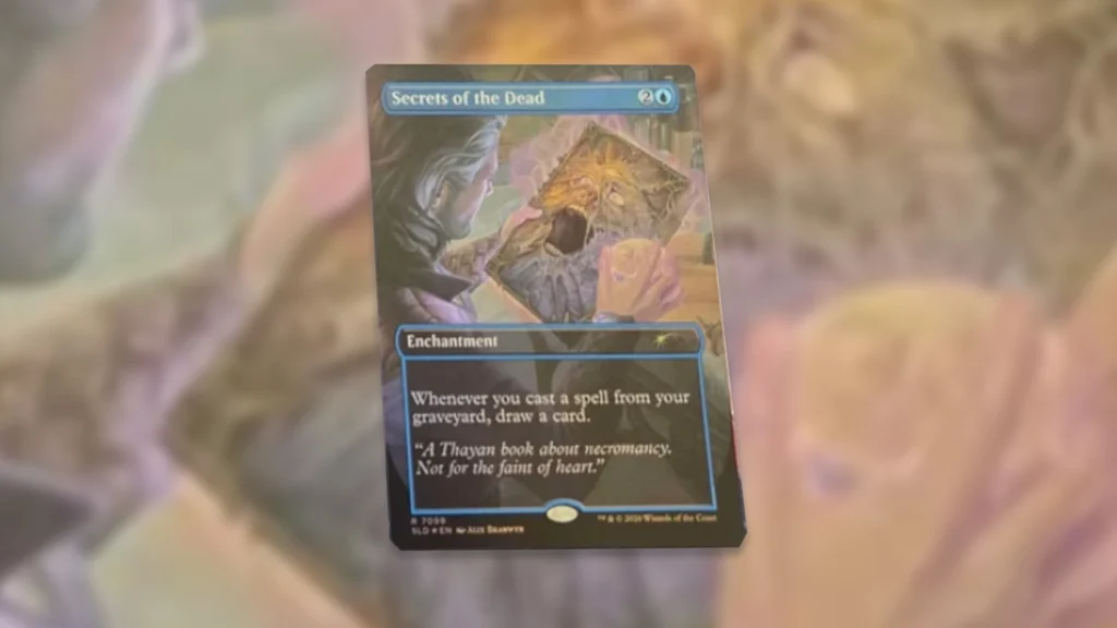 Keeping in the spirit of Secret Lair, we also have a bonus card from the Gale’s Ambition drop. Secrets of the Dead is a simple design, but it has incredible upside in the right Commander deck. This enchantment commonly shows up in Muldrotha, the Gravetide and Iroh, Grand Lotus shells built to cast cards from the graveyard turn after turn.