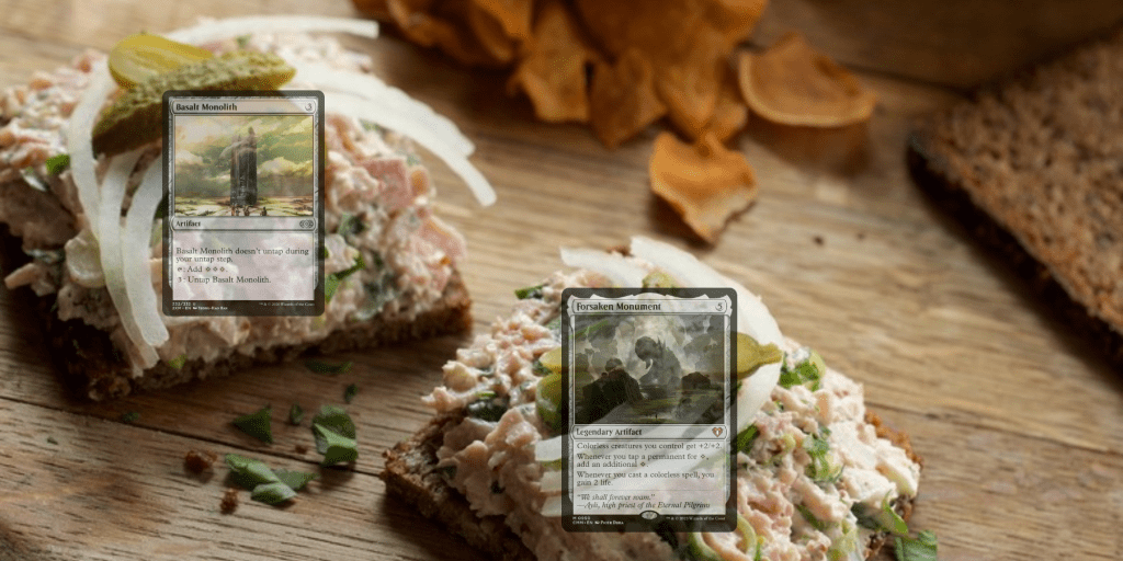 The pickles and lettuce on his sandwich…the way they were arranged…looked exactly like a legendary creature with the rules text of both Basalt Monolith and Forsaken Monument that only cost 2 mana.