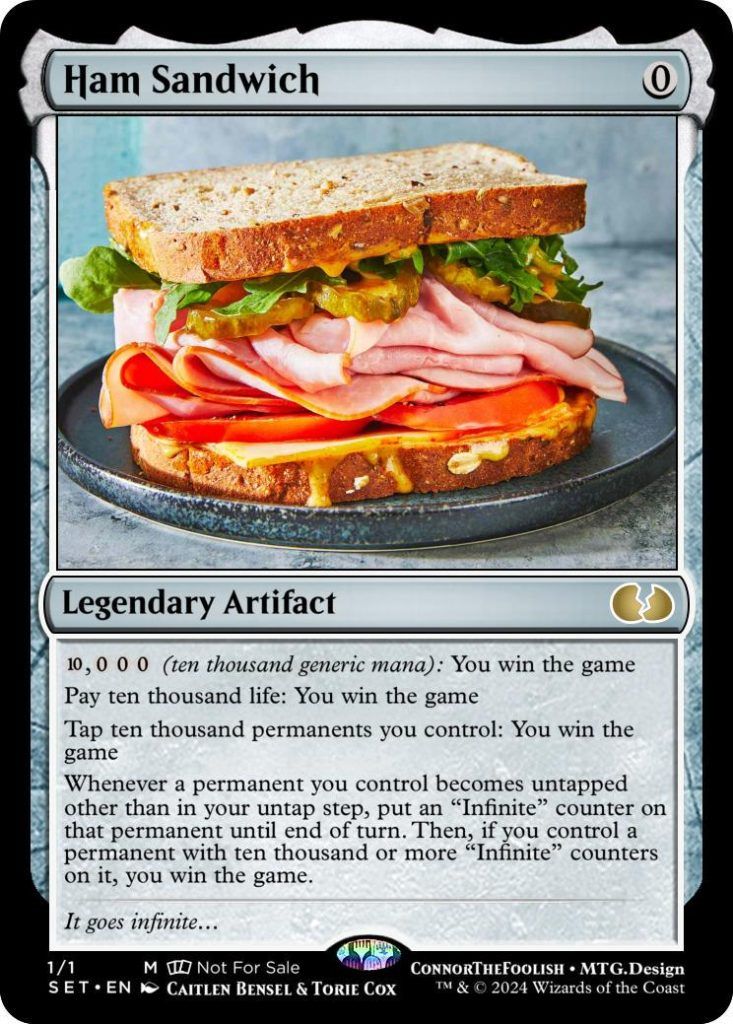 Rule 012345.lol – If a ham sandwich has the rules text of a card on it, it becomes a 5-color legendary creature with a mana cost equal to the number of extra condiments added to it beyond cheese, ham and mayonnaise, and gains the rules text of each card whose rules text is legibly written upon it.