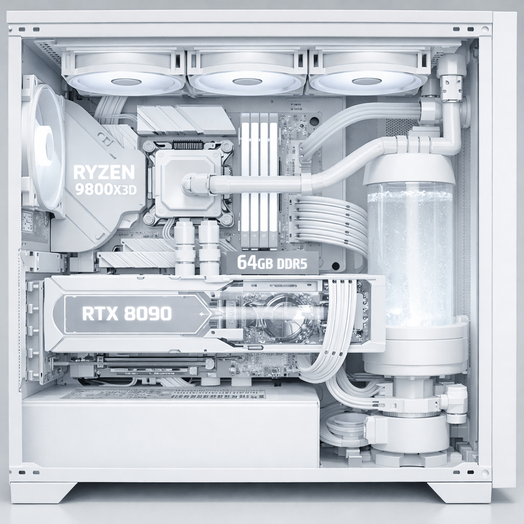 I asked chatgpt to make a pic of a all white gaming pc with a rtx 8090 a ryzen 9 9800x3d 64 gigs of ddr5 ram and liduid cooling. This is what it made
