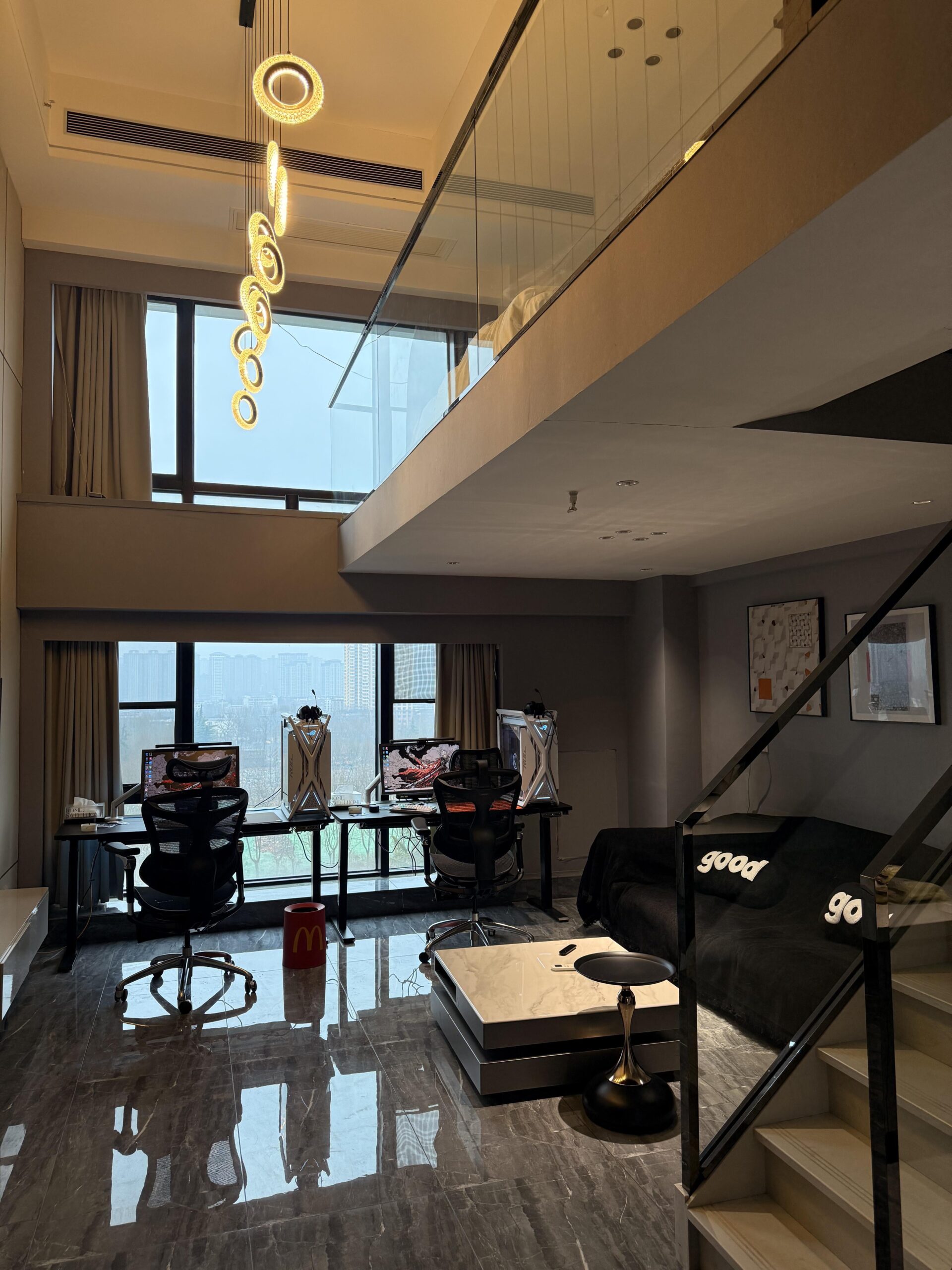 I placed the battlestation on the lower level right in front of the massive floor-to-ceiling windows, and turned the entire upper mezzanine into an open sleeping loft. Falling asleep while looking down at the setup is honestly addictive.