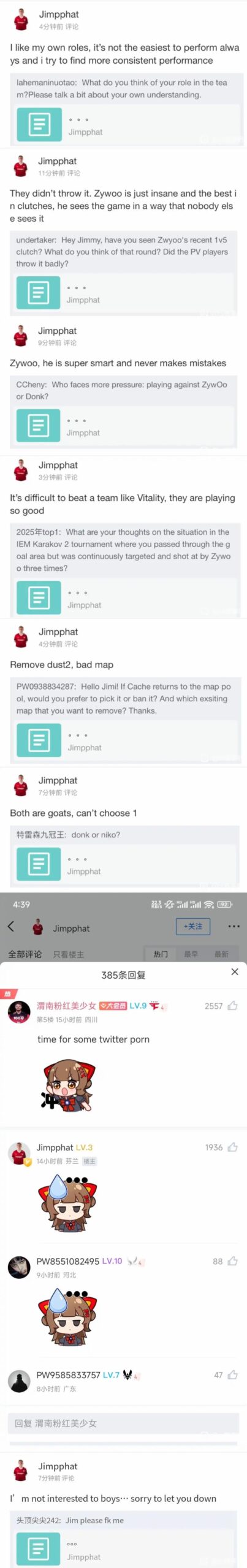 Jimpphat is chilling on Chinese CS platform and answering some questions by fans