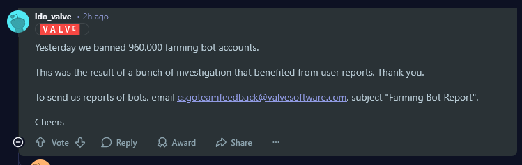 Yesterday Valve banned over 960,000 farming bot accounts
