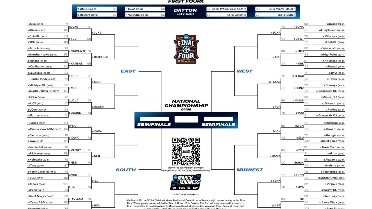 Here is the official 2026 NCAA tournament bracket for March Madness and the DI men’s basketball tournament. The Sweet 16 begins Thursday, March 26 with four games.