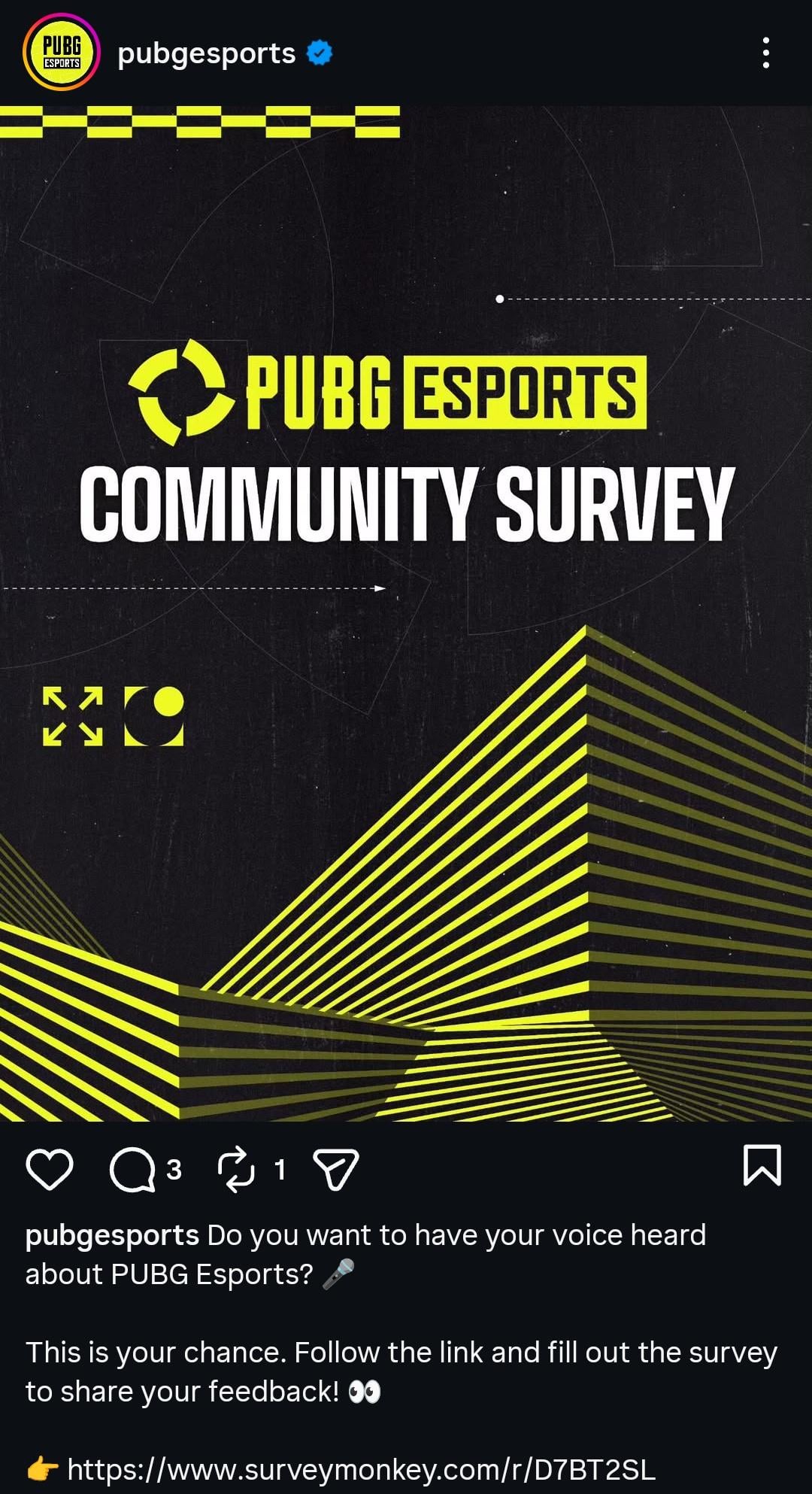 In case people want to make their voice heard for any reason in particular 👀https://www.surveymonkey.com/r/D7BT2SL Competitive PLAYERUNKNOWN'S BATTLEGROUNDSCompetitive PUBGPLAYERUNKNOWN'S BATTLEGROUNDSPLAYERUNKNOWN'S BATTLEGROUNDS CompetitionsPLAYERUNKNOWN'S BATTLEGROUNDS EsportspubgPUBG CompetitionsPUBG Esports