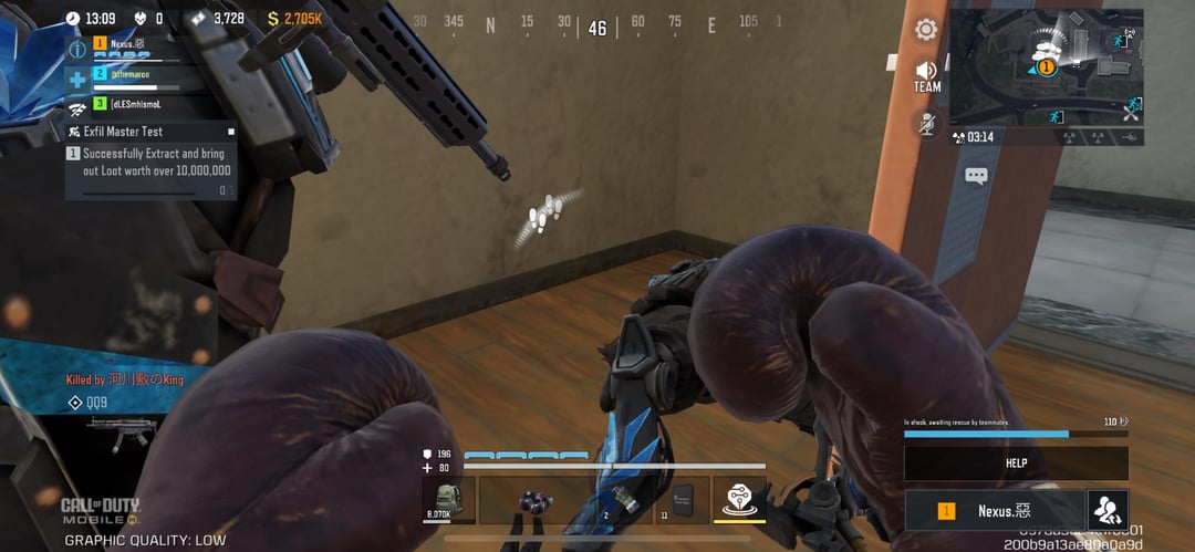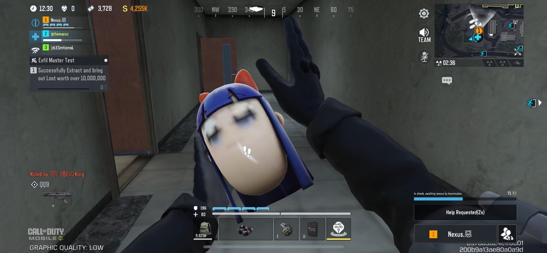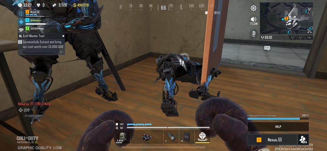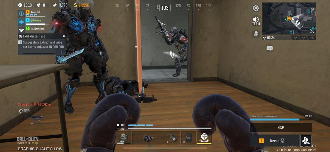 I’m Player 2 and Player 1 is the cheater. You can see him next to the enemy team looting me. You can also see the enemy team footprints on the mini-map. He didn’t attempt to save me. He only inspected the ultra (yellow) item to troll me afterwards rather than reviving me.