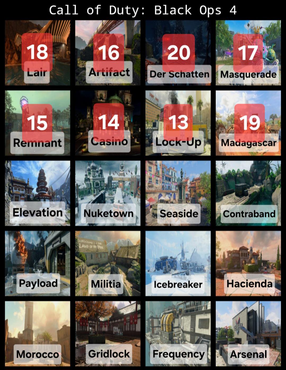 Elevation, Nuketown, Seaside, Contraband, Payload, Militia, Icebreaker, Hacienda, Morocco, Gridlock, Frequency, Arsenal