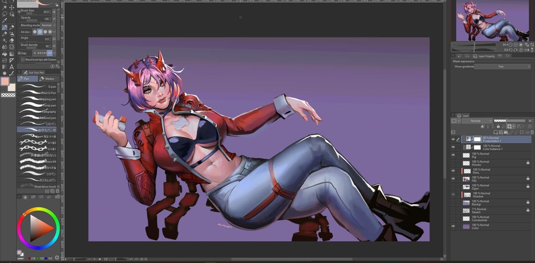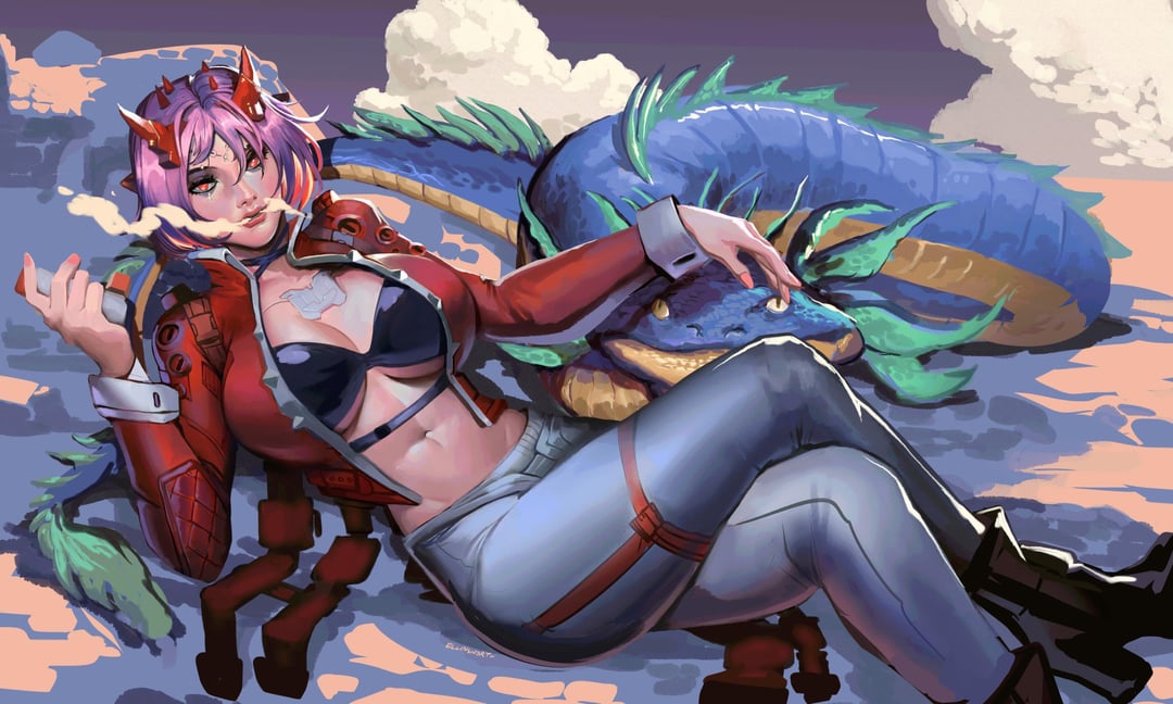 She has cyber-implant, the dragon does not. Art by me.