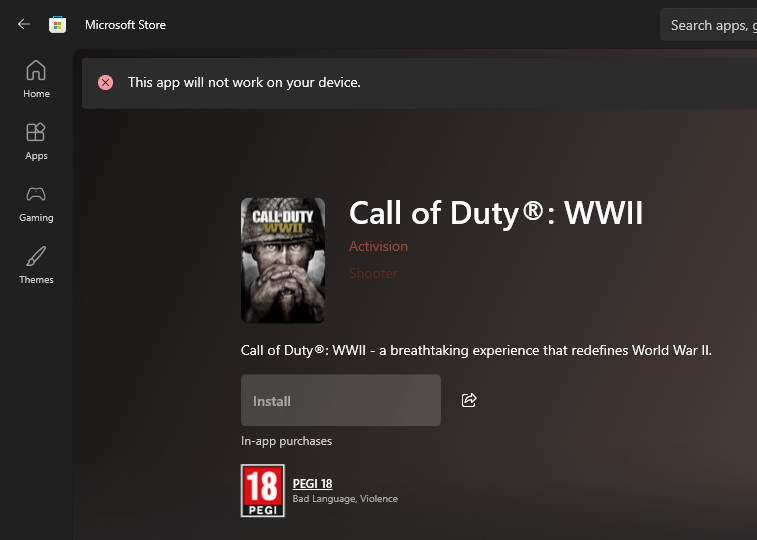Recently bought COD WWII Digital Deluxe Edition on PC via a key and redeemed it on the XBOX app. When searching through my library it's shows the game and all the DLC but it doesn't allow to install it, instead having the install button greyed out and text of "This app will not work on your device" without any explanations as to why. Windows 10, GTX 1070, i7-10700f, 16GB RAM. Any advice?
