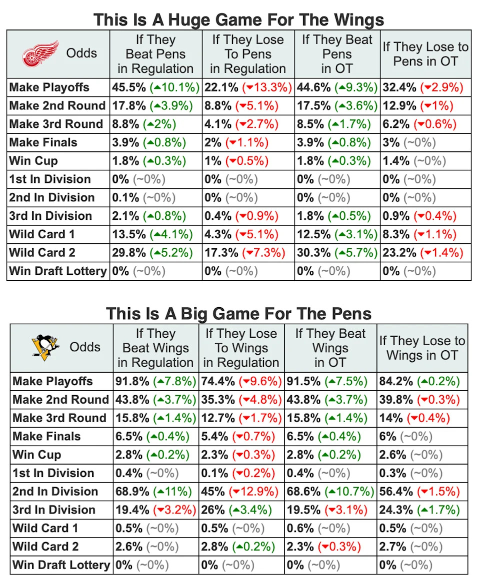 Tonight is another game with major implications for the Eastern Conference playoff race, per MoneyPuck. The Pens could take another step toward clinching a playoff spot with a win, while the Red Wings’ postseason hopes would plummet with a loss.