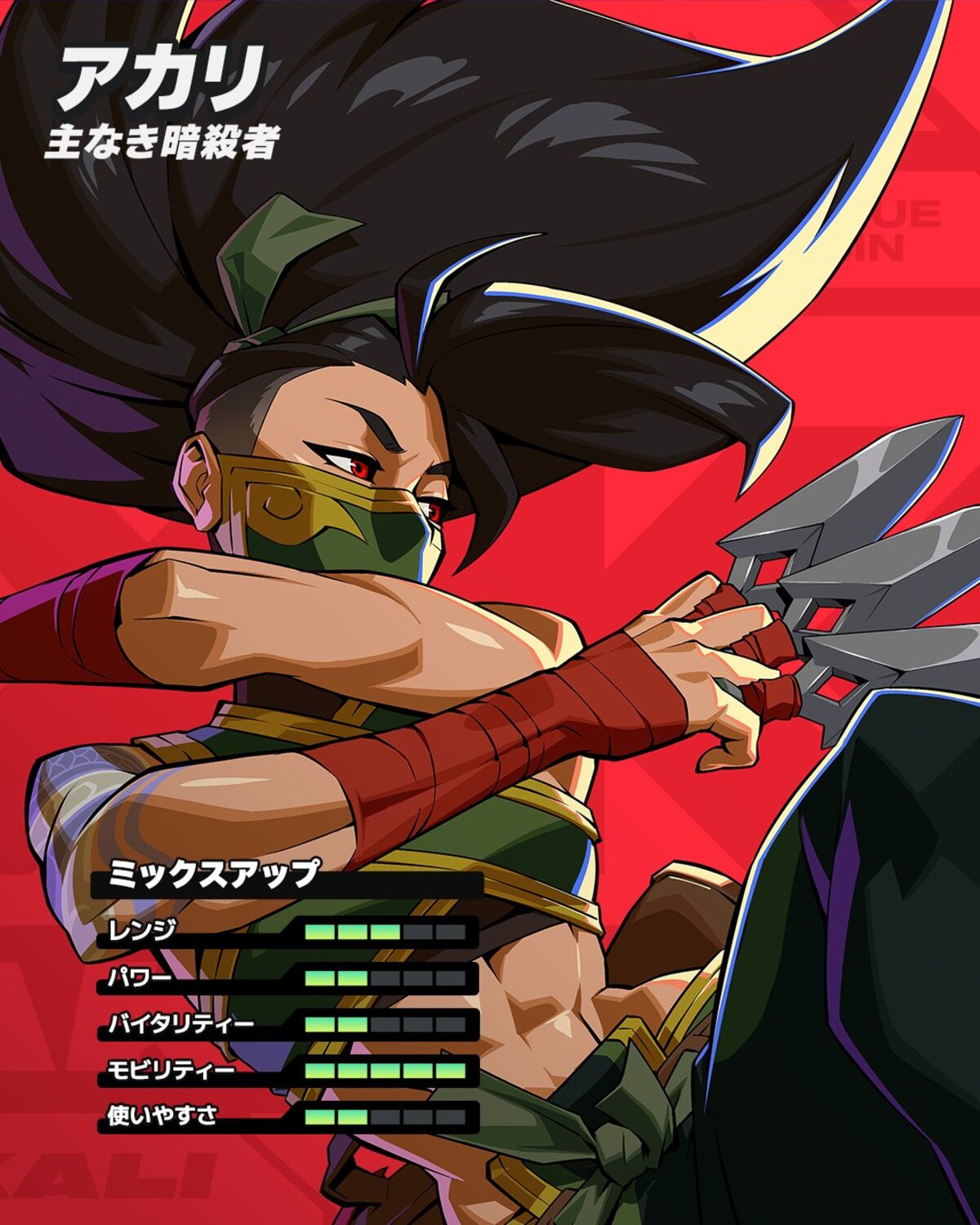 According to the released parameters, Akali boasts performance that is highly specialized in mobility. It seems that a significant amount of training will be necessary to master that quickness, but the sense of exhilaration when completing a match should be exceptional.