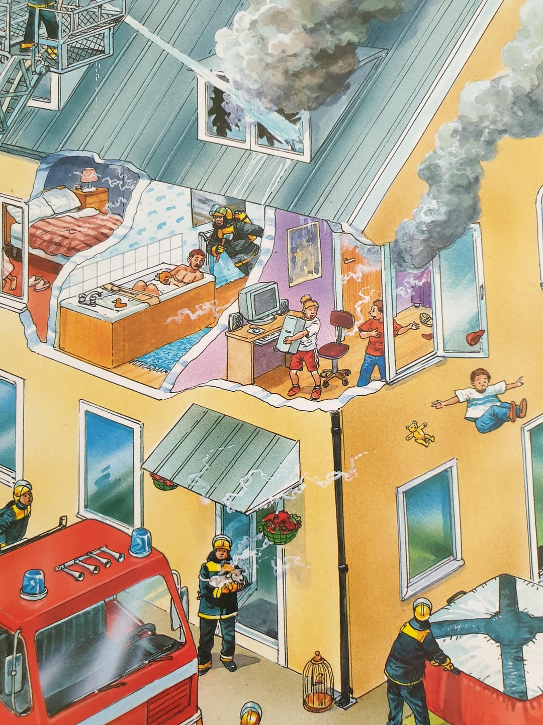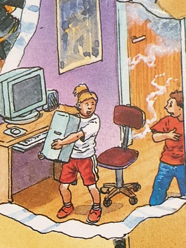 This children book illustration showing a young pcmasterrace member in a house fire