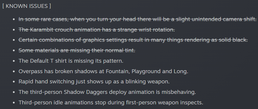 Share Facebook Twitter Pinterest LinkedIn Looks like Valve are using the latest patch note to communicate and track major issues they are aware of (you love to see it). Counter strikecounter strike global offensivecs:goGlobal offensive