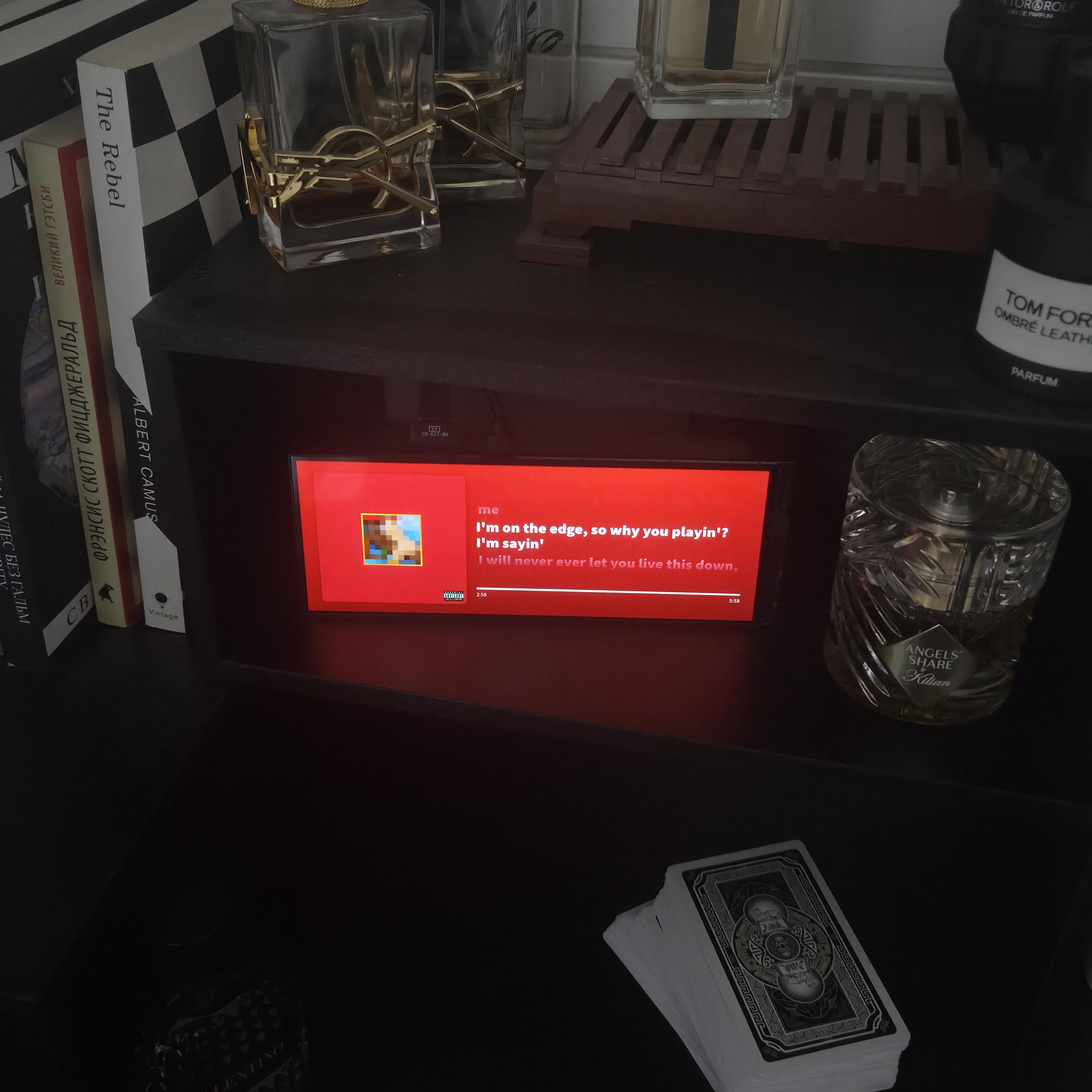 I’ve been working on a small desk display focused on music. It shows what’s currently playing along with synced lyrics, styled to match the album art.