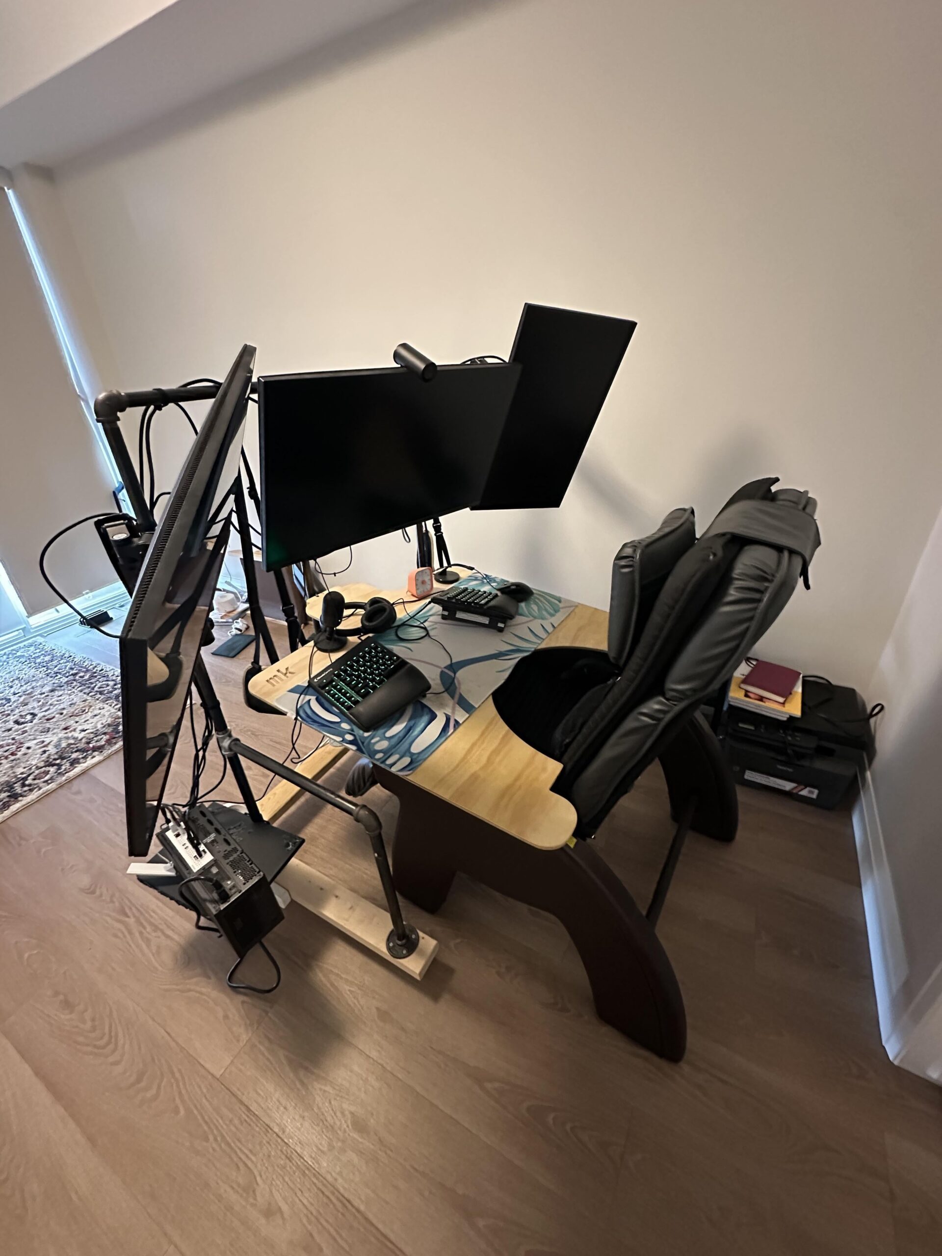 So I ripped off a recliner workstation from this post a year or so ago to help me manage my raging back pain. But I added one component: I CNC'd a plywood desktop that gave me more freedom and allowed for more comfortable arm positions.