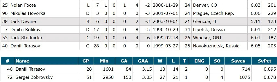 Goalies: Sergei Bobrovsky and Daniil Tarasov
