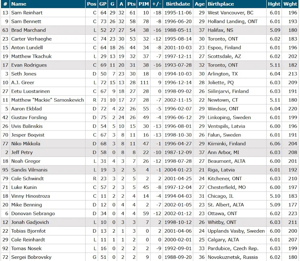 Potential scratches: Aaron Ekblad, Dmitry Kulikov, Sam Reinhart, Anton Lundell, Uvis Balinskis, Cole Reinhardt