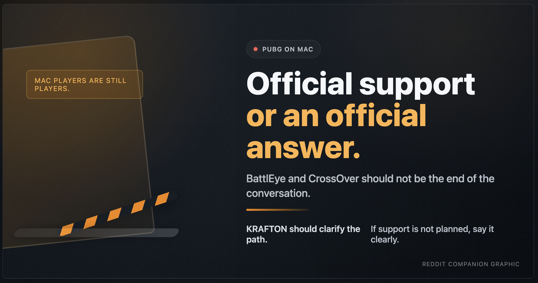 Right now, the usual answer is basically: BattlEye and CrossOver do not work together, so PUBG on Mac is not happening. But that turns a developer support decision into if it were just a random technical law of nature. It is not. If support is blocked, then that is part of a product decision too, not just an unfortunate footnote.