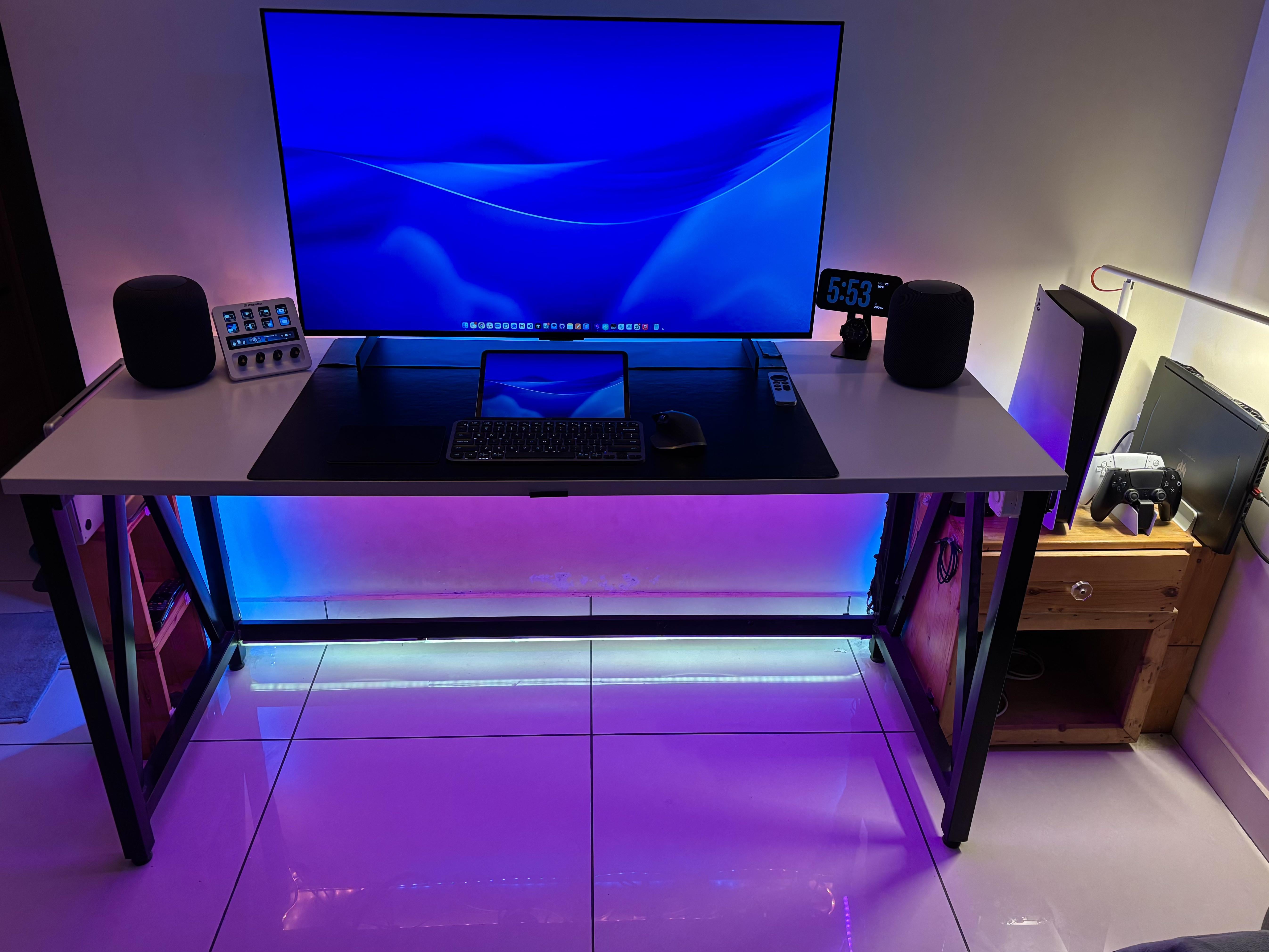 My current setup with dual laptop (work + personal/gaming) ps5 and apple tv. This is a do it all setup and both laptops can be switched using a kvm mounted under the desk (actually a lot of stuff is hidden under the desk)