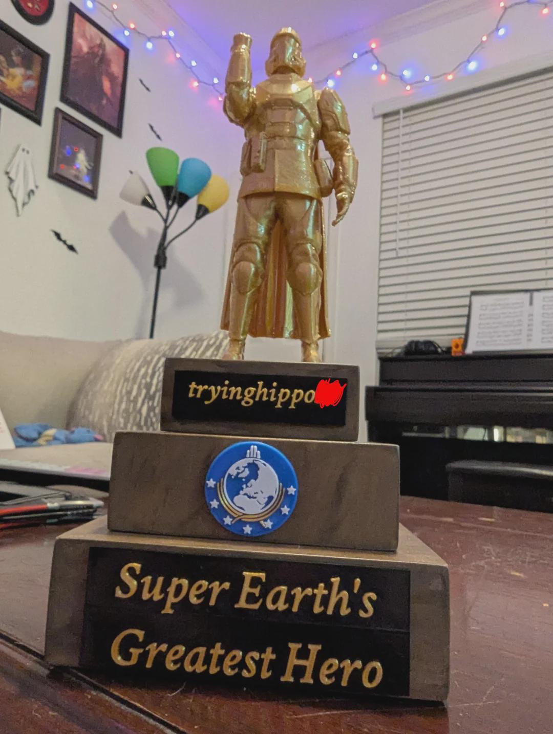 My best friend back home has been down lately so I decided to try my hand at some 3d modeling and put this neat little trophy together for him since we play Helldivers 2 together a lot. All 3D printed, sanded, painted, primed and glued by me. Went down a couple rabbit holes to texture PLA like wood and it came out pretty good! I plan on having an impromptu award ceremony at his house, and give a speech that really amps up how impactful his contributions to Super Earth have been. I'm also putting together a Helldiver cosplay so I plan to present the trophy to him in full Helldiver costume, and he's going to have to improvise an acceptance speech haha. Below is the speech I plan to give, I'd appreciate feedback if there's any Democracy officers out there who happen to see this.