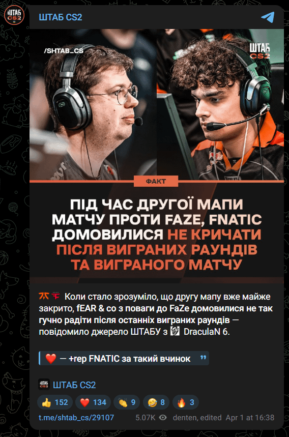 Once it became clear that the second map was all but wrapped up, fEAR & co agreed — out of respect for FaZe — to keep their celebrations low-key after the final rounds. This is according to sources from the Ukrainian Telegram news channel ‘shtab2’ at Draculan 6.