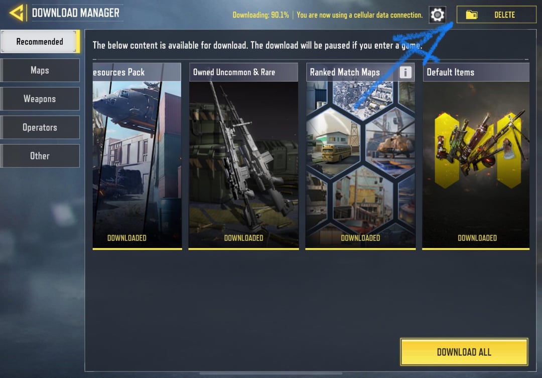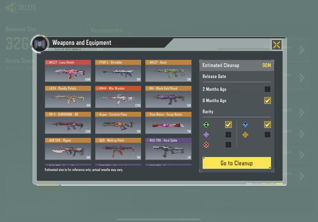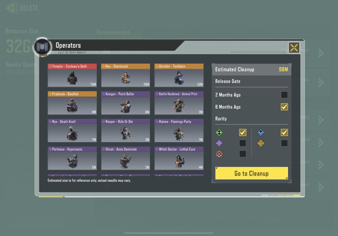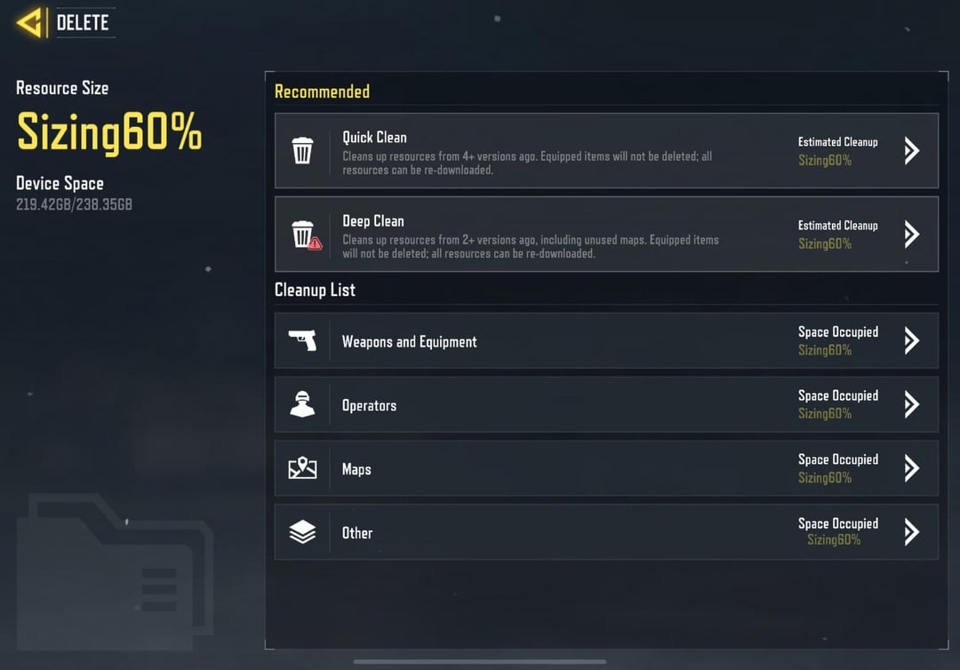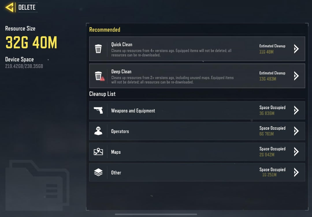 CoDM today on April 8 added a feature that is critical. A very detailed resource delete and manage option. Thank you to the devs and codm for this. I personally download 100% but a lot of players have suffered due to lower storage availability on their device or unable to delete a specific rare or epic items. Which is now an option. THANKYOU CoDM. Big W