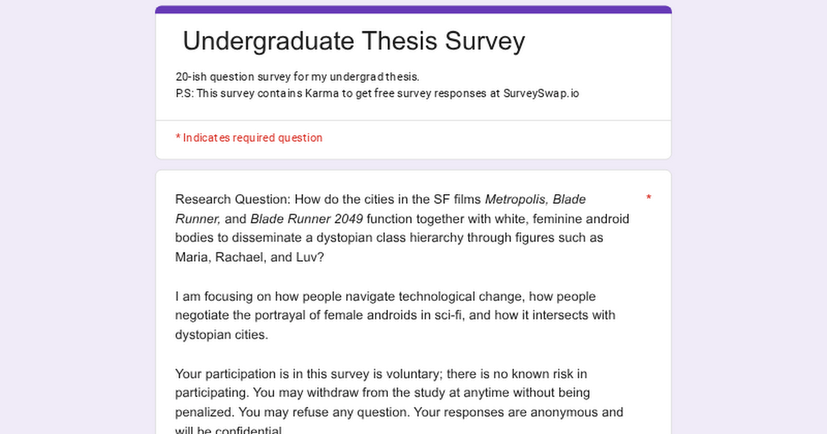 Hii everyone! I am looking for survey participants for my thesis. All responses will be confidential and used for academic purposes only. The data gathered from this study will only be used for my analysis. Thank you! If you're interested in discussing more, I am also looking for interview participants who have seen either Blade Runner, Blade Runner 2049 or Metropolis (paid 20$, 50 mins). Please send me a message on reddit if interested.