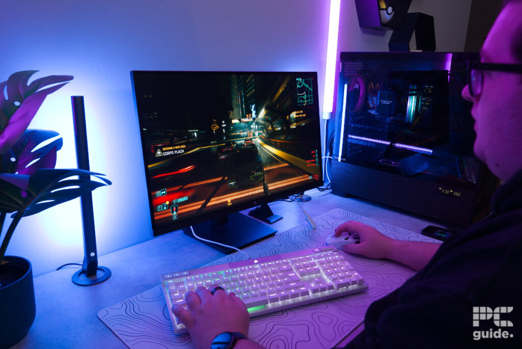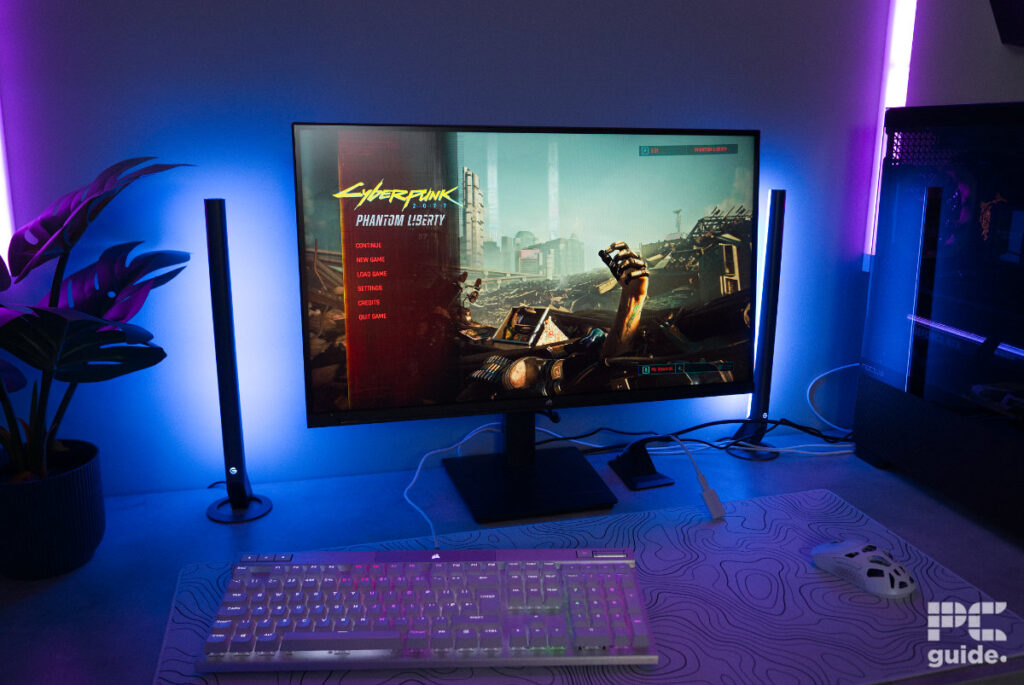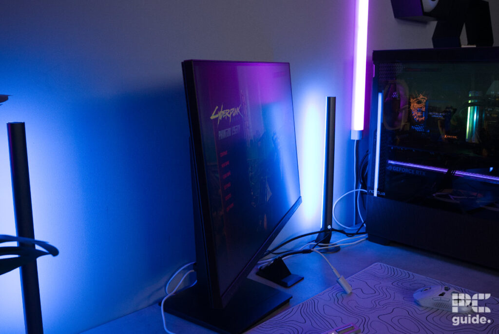 After this, I tried something a bit slower, less dependent on the monitor’s refresh rate. I booted up Cyberpunk 2077. With high settings and ray tracing enabled, the monitor does look good. Even without eye-straining brightness, there is a decent level of contrast, and colors do stand out. Although its black levels don’t quite reach perfection, they are still at a decent level for the monitor.