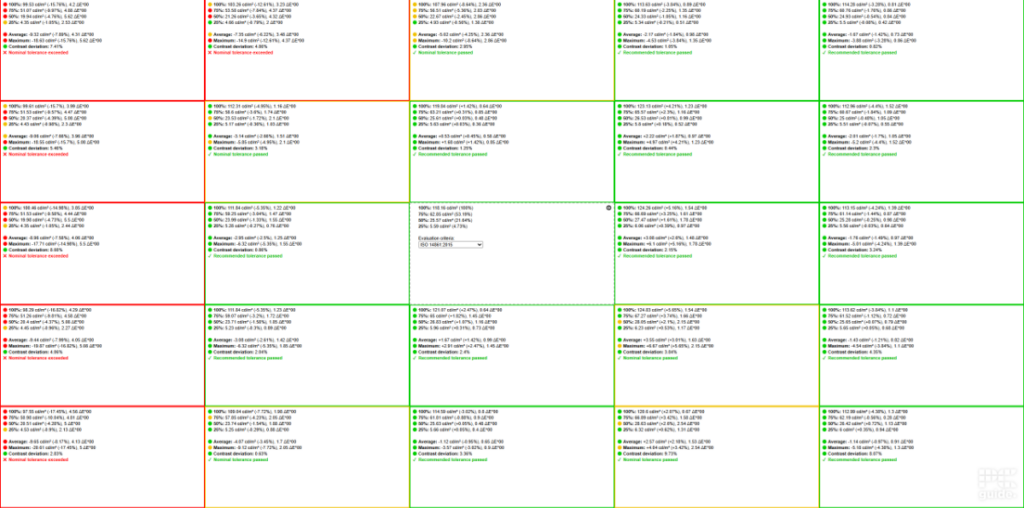 whiteblackcontrastaverage deltaE*00max deltaE*00gammaBrightnessIDEAL6500K0 cd/m²infinity:1002.2120 cd/m²Standard warm6242K0.0809 cd/m²1473.8:12.578.122.13119.3 cd/m²Standard natural7164K0.0879 cd/m²1370.4:12.377.312.14120.5 cd/m²Standard cool8462K0.1015 cd/m²1191.3:12.256.572.15120.9 cd/m²Movie6508K0.2651 cd/m²1469.4:12.817.752.08389.6 cd/m²Standard user6535K0.0811 cd/m²1482.7:12.467.822.13120.3 cd/m²Calibrated6541K0.0811 cd/m²1463.1:10.52.972.2118.6 cd/m²