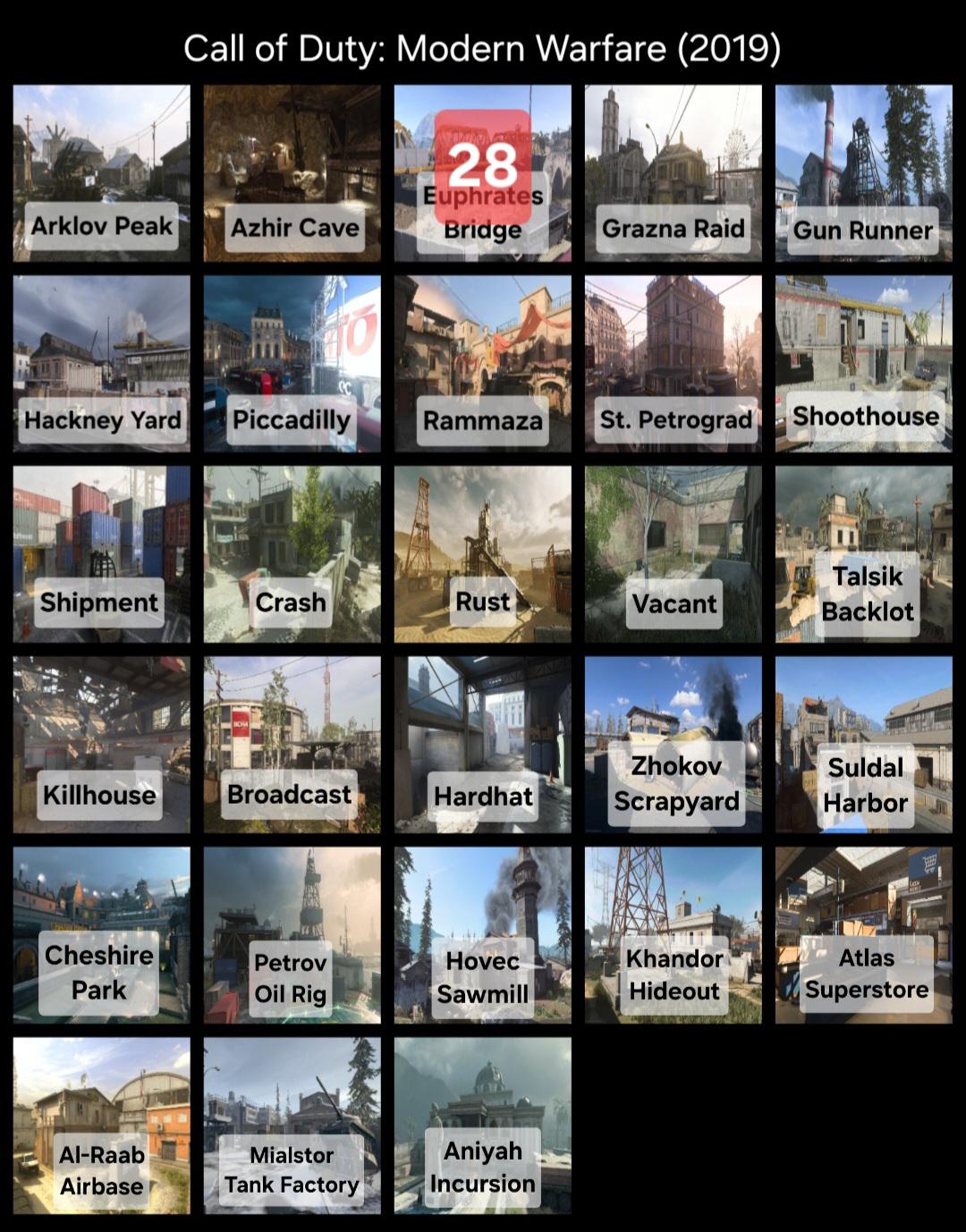 Arklov Peak, Azhir Cave, Grazna Raid, Gun Runner, Hackney Yard, Piccadilly, Rammaza, St. Petrograd, Shoothouse, Shipment, Crash, Rust, Vacant, Talsik Backlot, Broadcast, Killhouse, Hardhat, Zhokov Scrapyard, Suldal Harbor, Cheshire Park, Petrov Oil Rig, Hovec Sawmill, Khandor Hideout, Atlas Superstore, Al-Raab Airbase, Mialstor Tank Factory, Aniyah Incursion