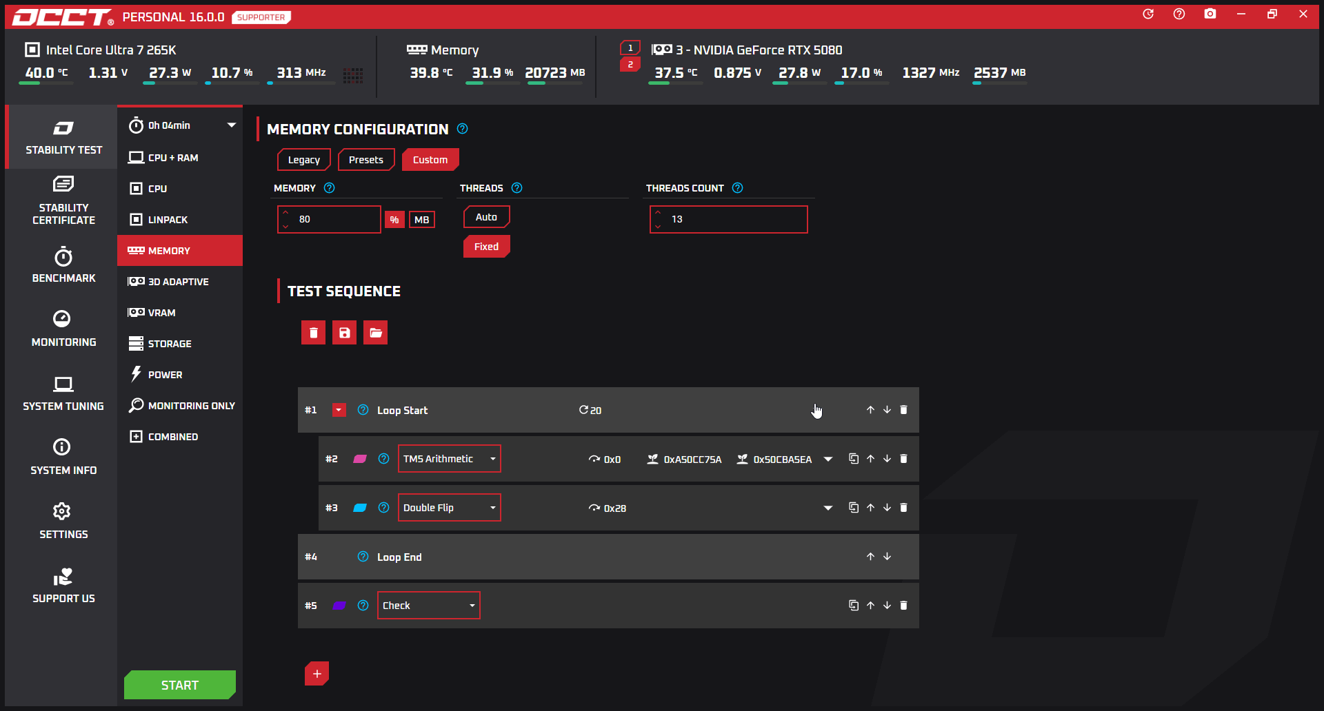 You have access to 16 different blocks to pile up and come up with your own memory stress test : Walking 0s, Walking 1s, MirrorMove, …
