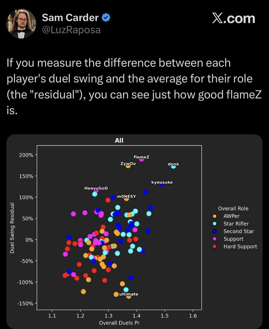 the data are ressource and position adjusted meaning for example flamez being A anchor is worse than zywoo/donk being con player on mirage, or donk/zywoo having better gun get less waited then flamez mac-10.