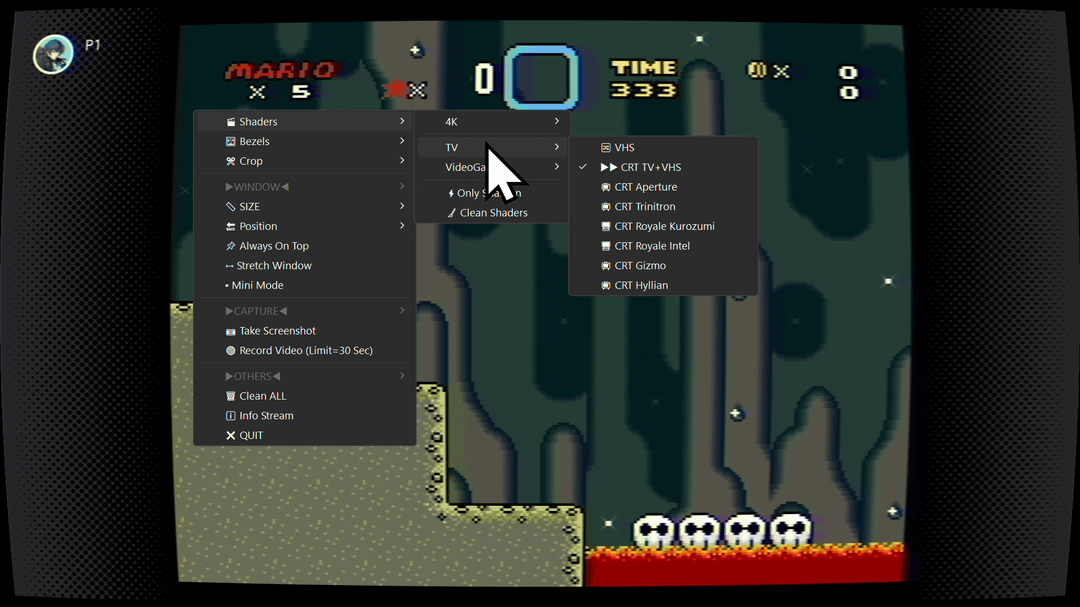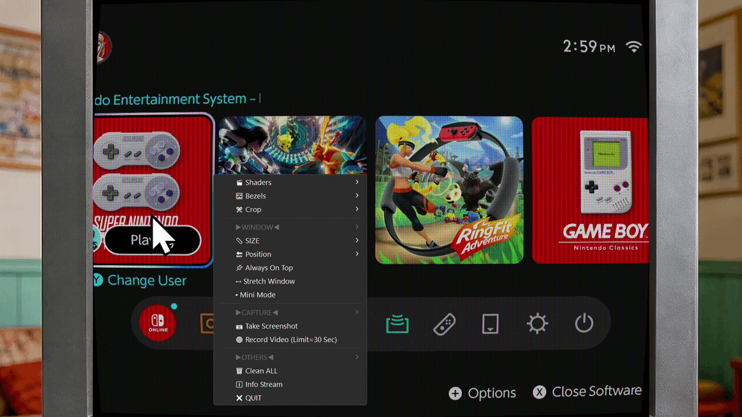 Similar to play in OBS, but, without lag, and neat features like bezels, crop and able to use shaders. Also take screenshots and record videos. All with a custom menu.