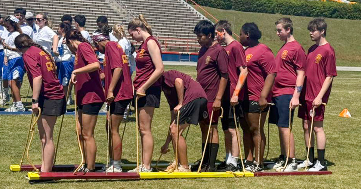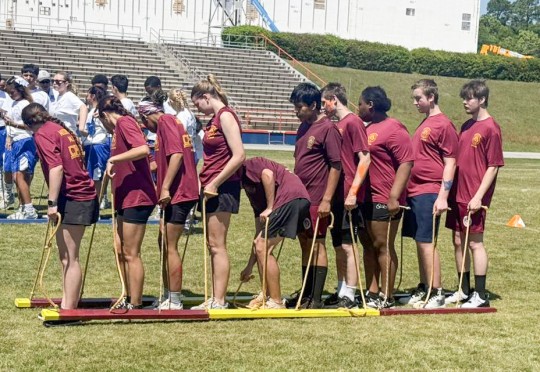 Australian trolley (pictured top), an official NJROTC athletic competition, is a team coordination exercise where cadets stand on two long wooden boards (the “trolley”) and must walk in unison using hand ropes.