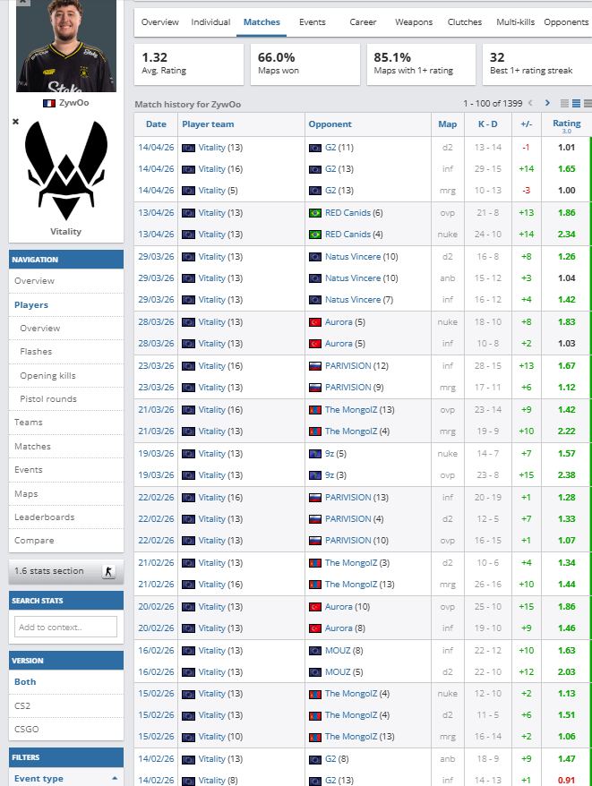 Zywoo is currently on a 29 map streak of having 1+ rating. (Old record being 32) Counter strikecounter strike global offensivecs:goGlobal offensive