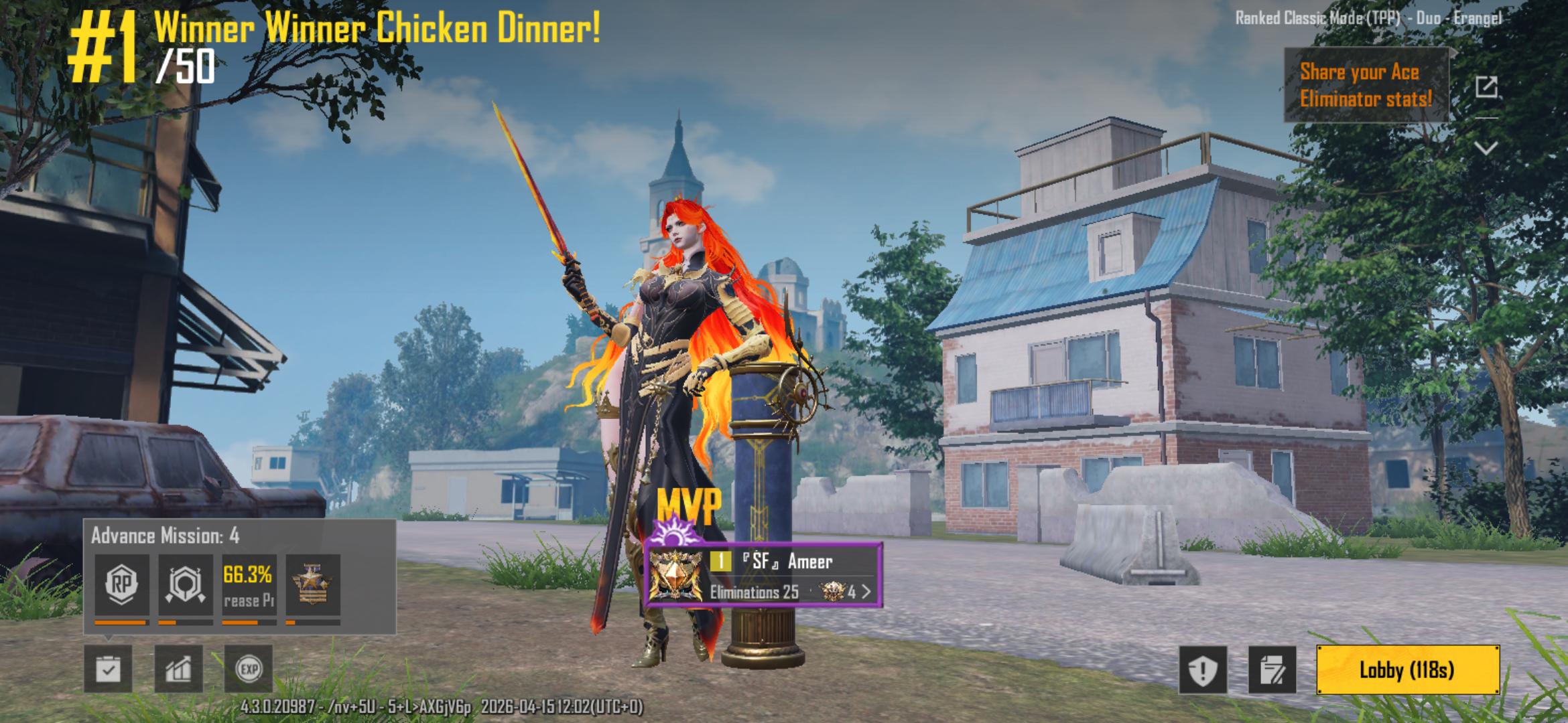 A 25 kill win in a Solo-Dous match on Pharoah mode Erangel.