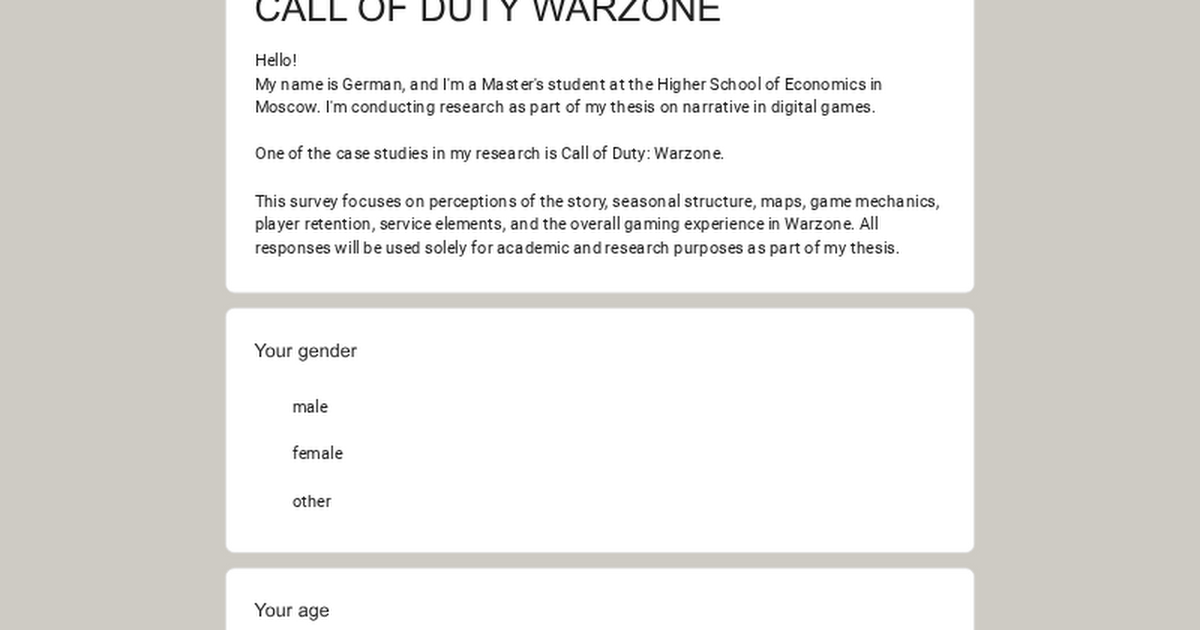 I’ve prepared a short academic survey about how players perceive Warzone — its story, seasonal structure, maps, gameplay systems, and overall player experience.