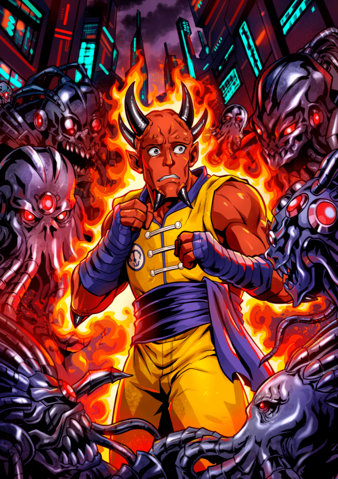 This is one of the variant cover illustrations for my cyberpunk battle manga's first chapter. The studio is Studiokapi0369 and the artist's name is Gowra Hari. They're seriously talented, and it's so cool to see my characters and design sheets re-interpretted by other artists! Makes it feel all official and stuff!