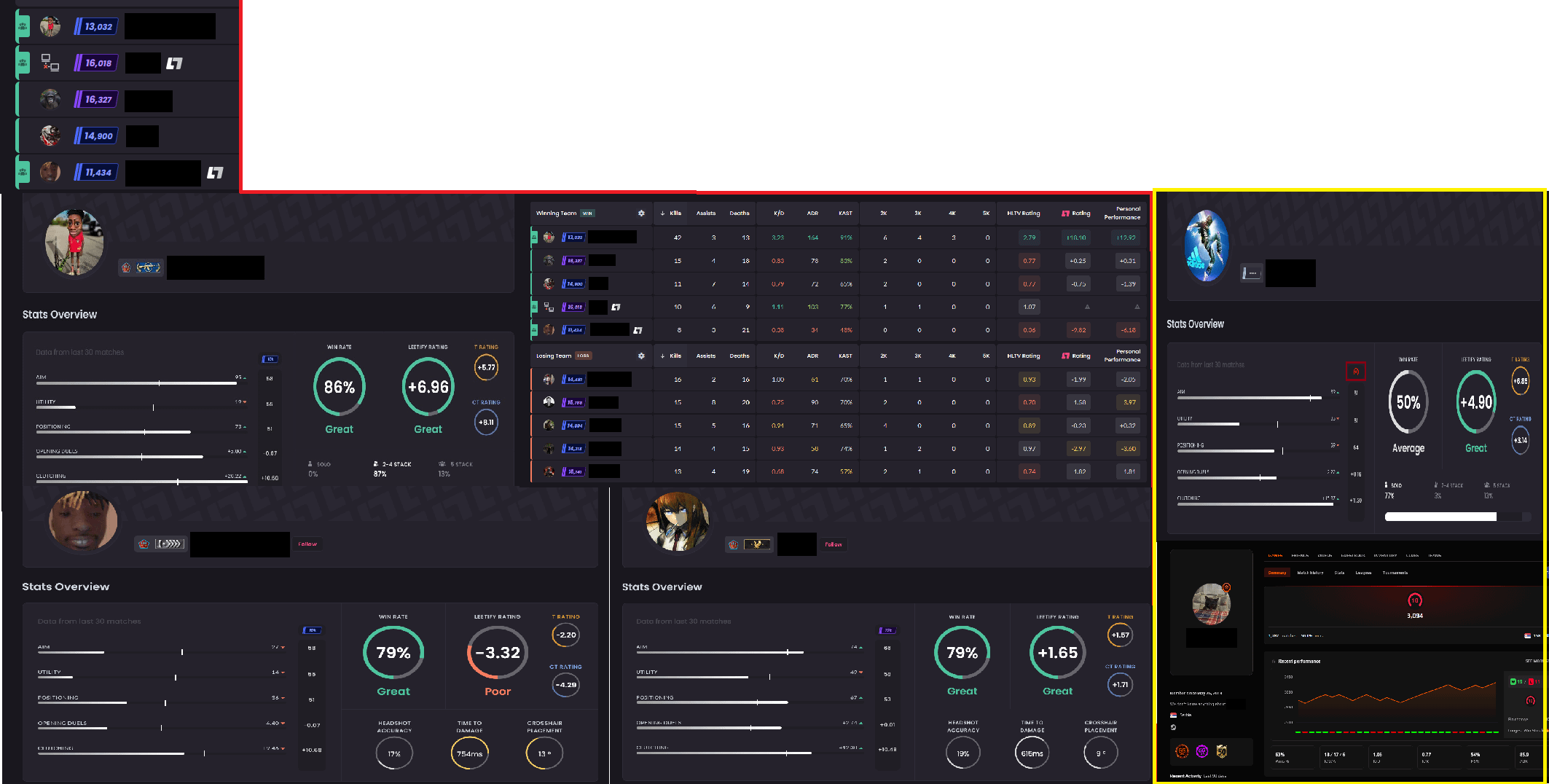 The first pictures, outlined in red, show a stack of 3 players who have played between 100-200 games together. They were suspicious in game, getting perfect timings every single round with incredible aim and reactions, complete with just 200-300 hours of game time and barren steam accounts or simply just low level private steam accounts. Of course they just said that they were having a really good game, and to check their awful leetify stats.