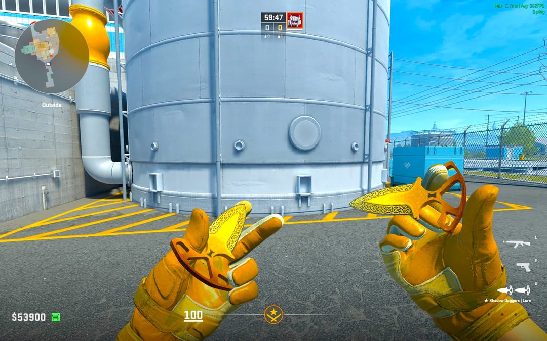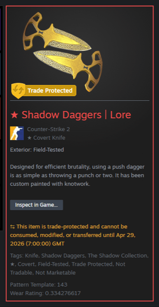 Long story short, me and my brother share a pc, but the steam account is mine (including all the skins), he traded my Black Laminate Bowie for a pair of Lore Shadow Daggers thinking it looked better with my Transport gloves and my The Outsiders AK.
