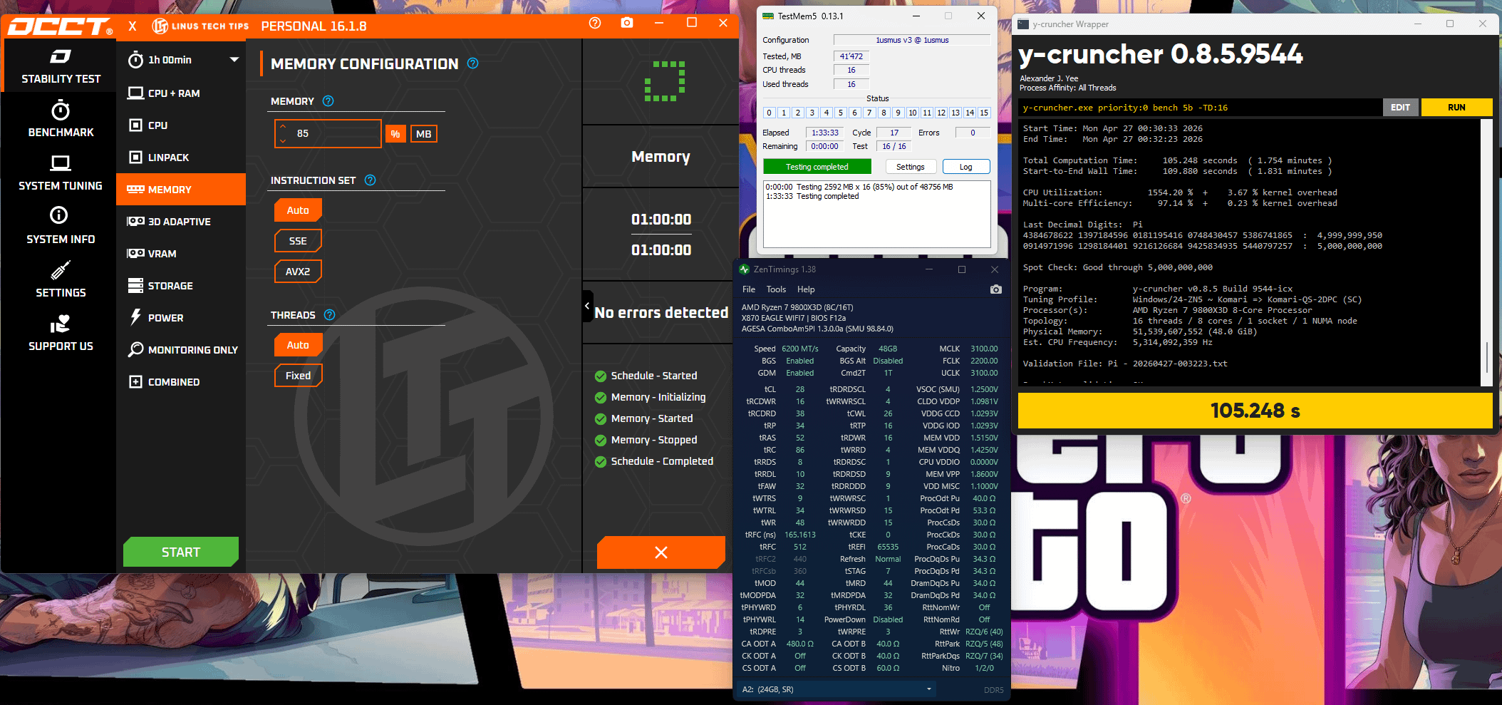 I will be testing for 6+ hours after I've installed a fan above the ram kit for cooling, as tempts were reaching 50.5 Celsius after 1.5 hours. For this setup, this is the limit, as lowering trfc leads to boot failure.