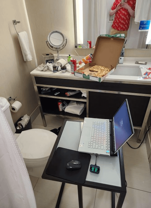 They ain’t got no desks in the actual room. Also, hella brave to eat cheesy bread in a hotel shitter.