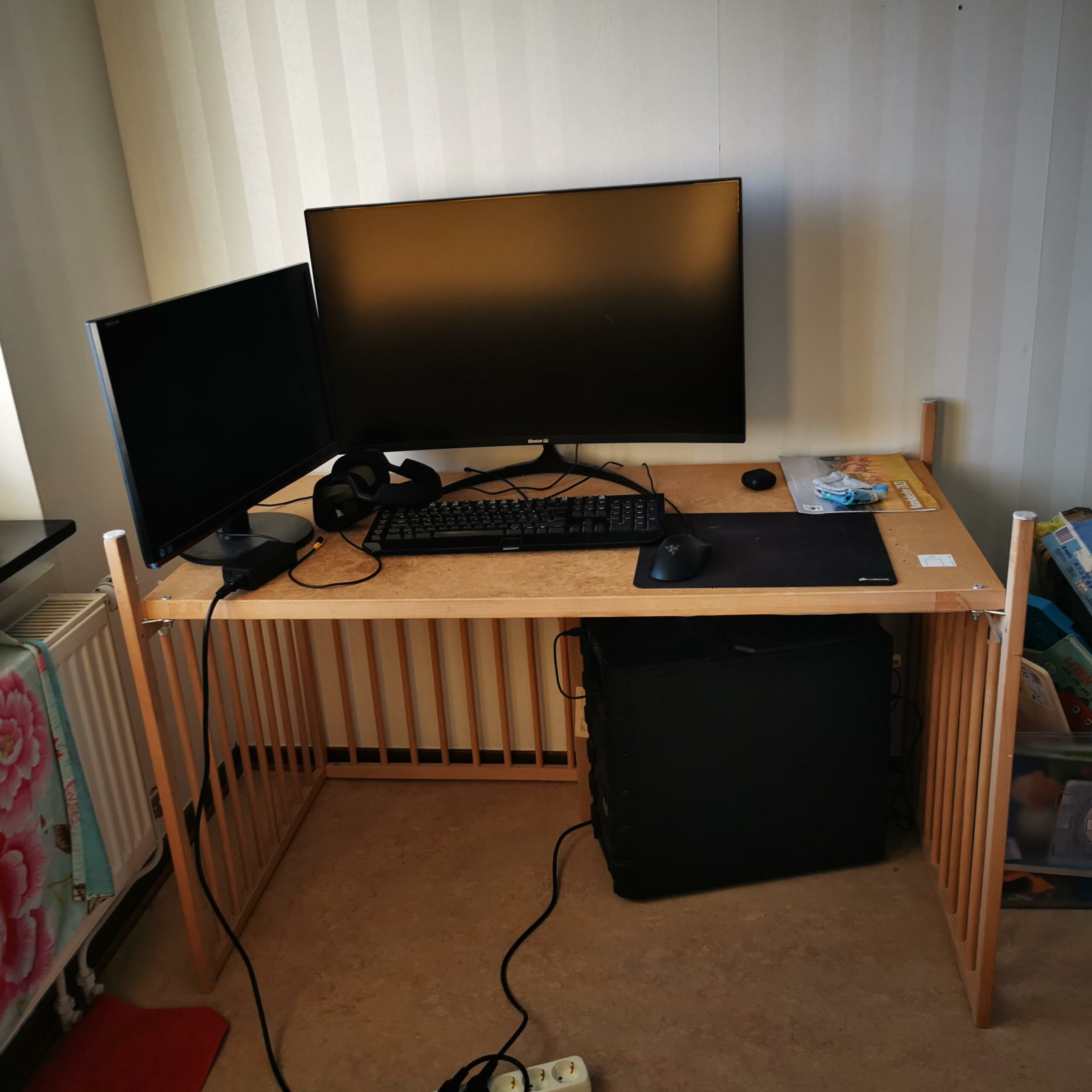 i’d recommend finding a way to get your pc off the floor and onto another table so it lives a bit longer. otherwise this setup fucks, not a horse but nonetheless enjoyed