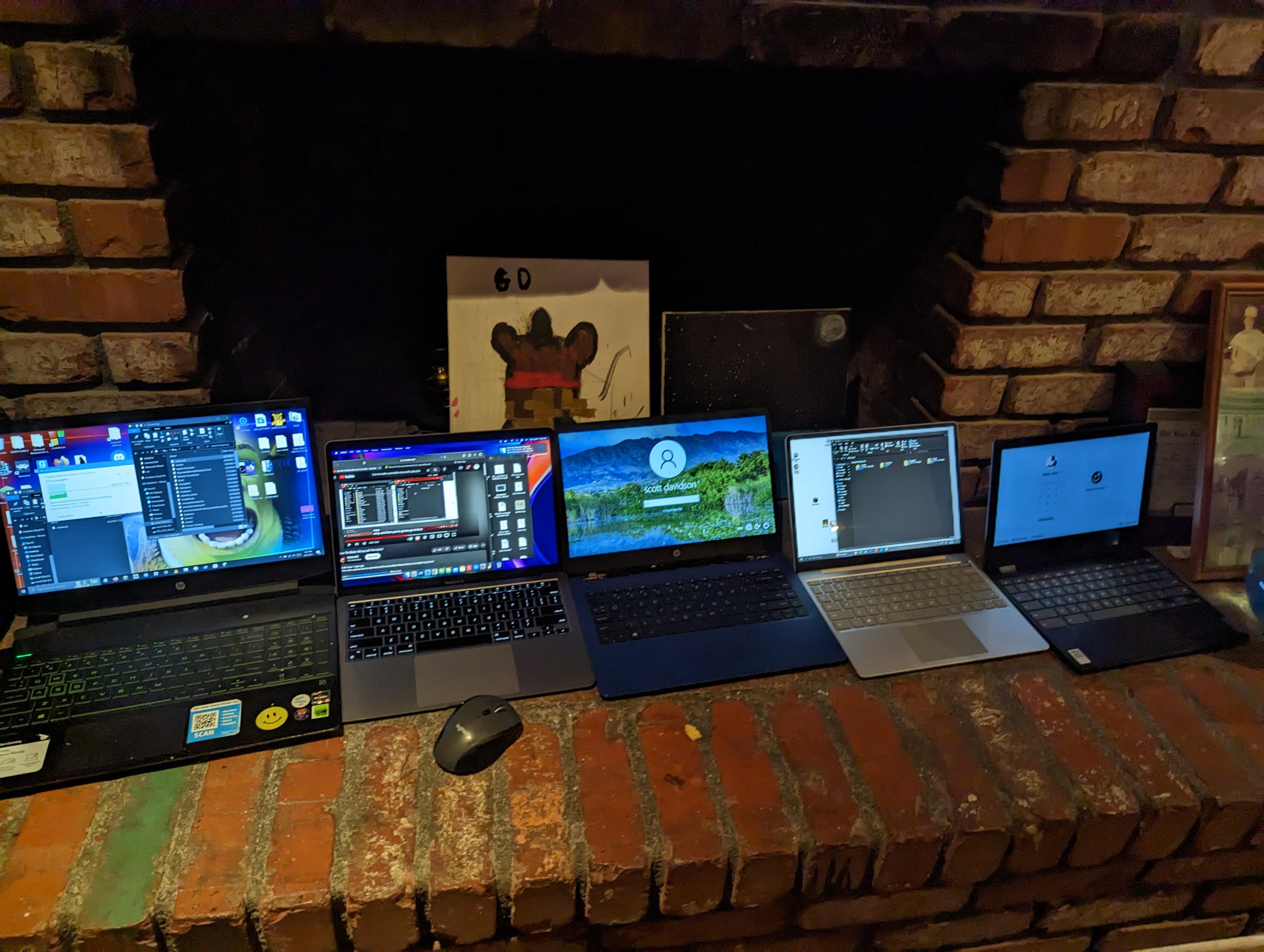 Share Facebook Twitter Pinterest LinkedIn 3 Windows laptops, one of them is a shitty school laptop, the other is a “beast” laptop, the 3rd is a shitty target laptop, I quite like it actually. One of them is a Mac computer (my favorite one) and the 5th one is a reject chrome. Shitty Battle StationsShitty Battlestations Write A CommentYou must be logged in to post a comment.