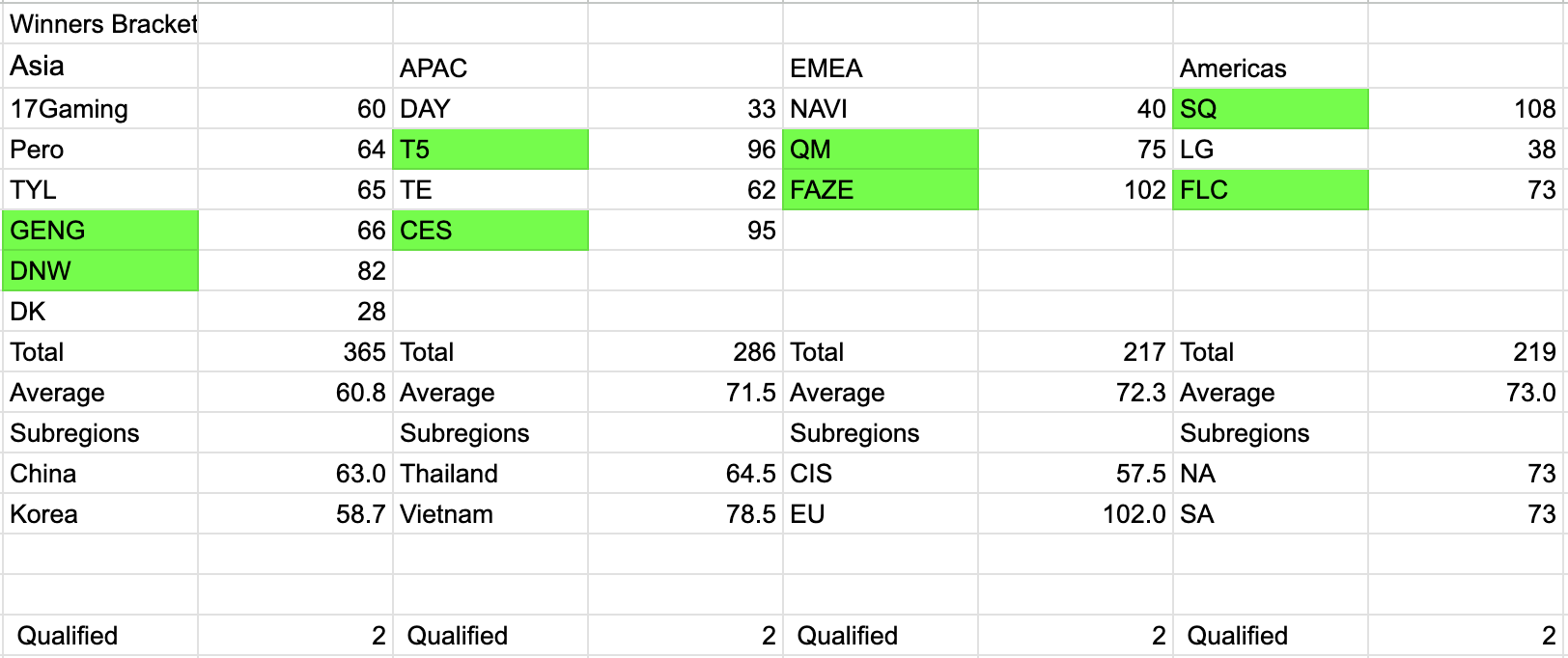 Thoughts on the Results based on region: >!It’s pretty interesting that 2 from each region made it so far and it’s crazt that there is a hypothetical scenario where no Chinese teams qualify. Also the averages of the Americas region are pretty funny as yes, they do all come up to 73.!<