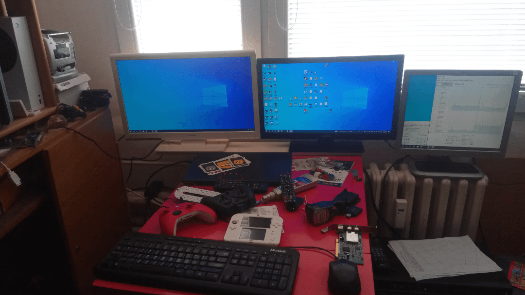 Share Facebook Twitter Pinterest LinkedIn Budget triple monitor setup (the sides are VGA) by kaktuschalpolak Shitty Battle StationsShitty Battlestations Write A CommentYou must be logged in to post a comment.