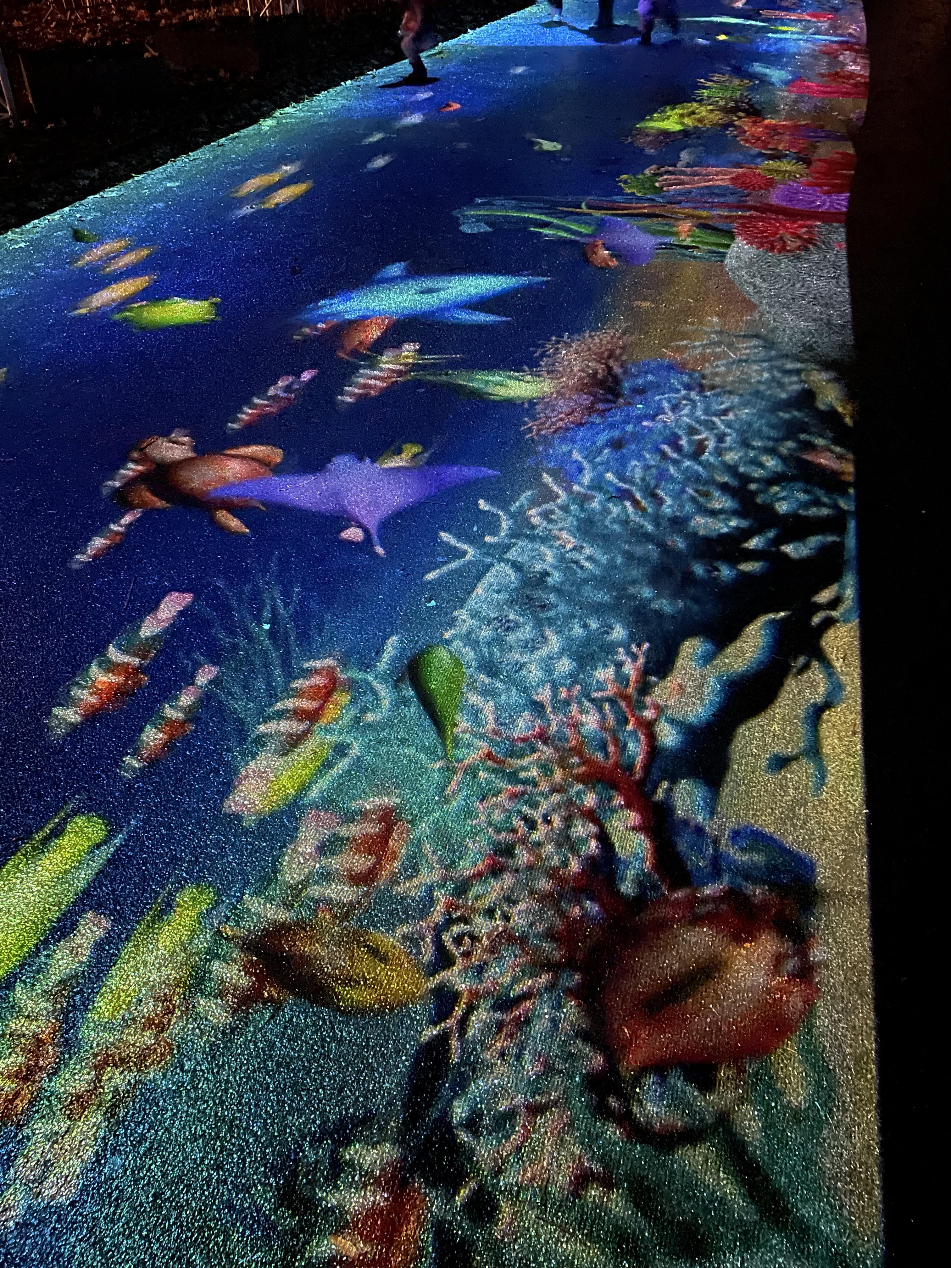 There is light show in my city. In zoo, illuminated sculptures of animals. There is also an array of projectors displaying coral reef on asphalt pavement. Cool fact – it’s interactive: when you jump or step on any of these fishes they jump aside like “escaping” from under your feet.