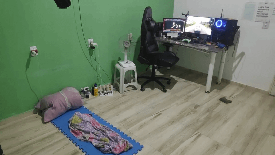 This is a typical guy in their late teens early 20s, parents kicked me out but I make enough money fuck your priorities kind of setup. I would at least get an air mattress or throw a mattress on the floor. No amount of xp is worth any future chronic back pain. Trust me I know.